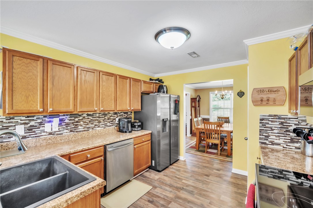 Imagine the quiet as you sit on your back (or front) porch enjoying your morning coffee. Step inside and see the formal dining room next to a gorgeous full kitchen (includes new stainless appliances installed in 2023) that overlooks the TV room. Enjoy the comfort of a downstairs bedroom and bath. Upstairs features a large Primary bedroom with a sitting area and an en-suite bathroom with all the room and amenities you need. Additionally, the walk-in closet is located off the en-suite bathroom. If you have lots of laundry, you're sure to love the upstairs laundry room! Outside, the large pie-shaped lot offers plenty of room for fun and outdoor activities. Fridge conveys. Roof is new as of 2022 with a transferable warranty (for a fee), New water heater 2025, New downstairs heat pump/AC 2020, new upstairs heat pump/AC 2019. Full downstairs LVP installed in 2020. This home is move-in ready!