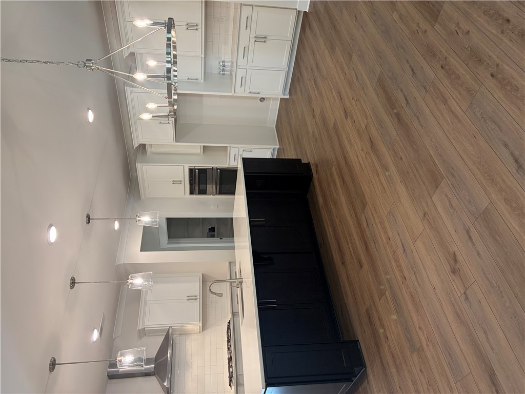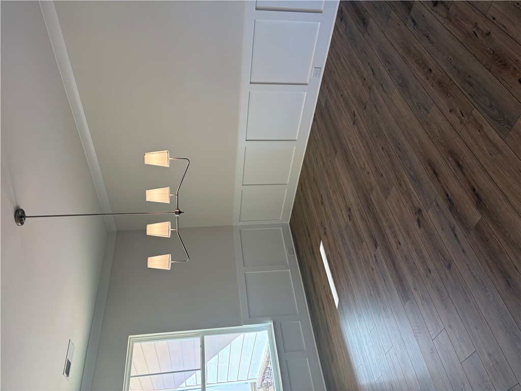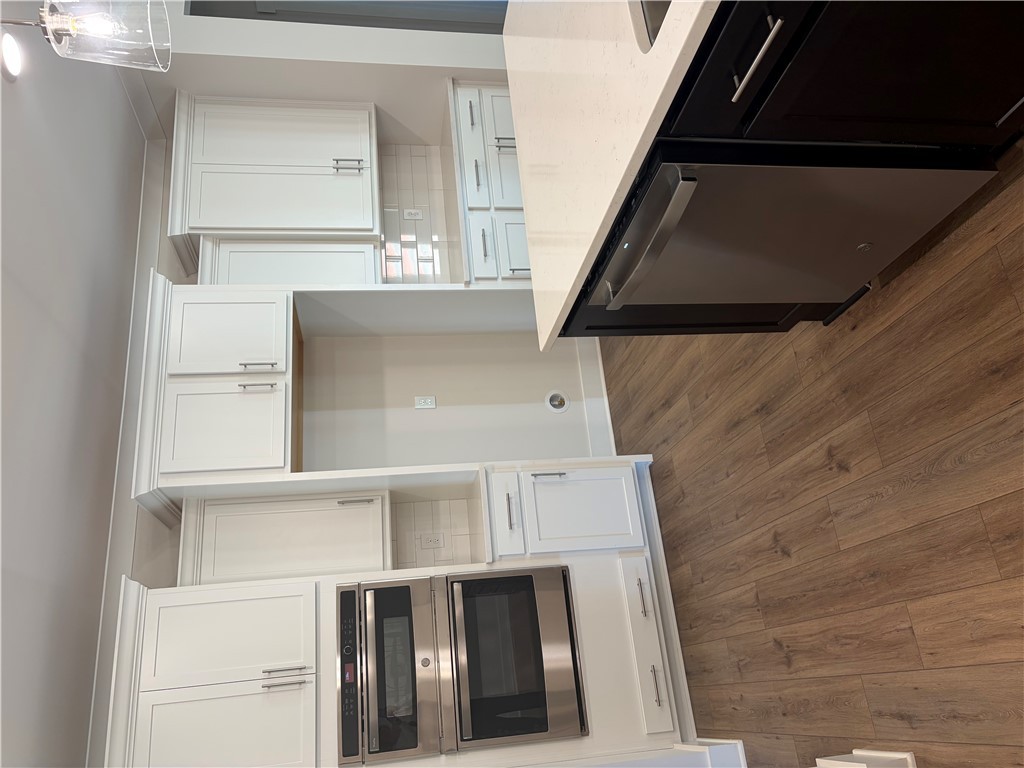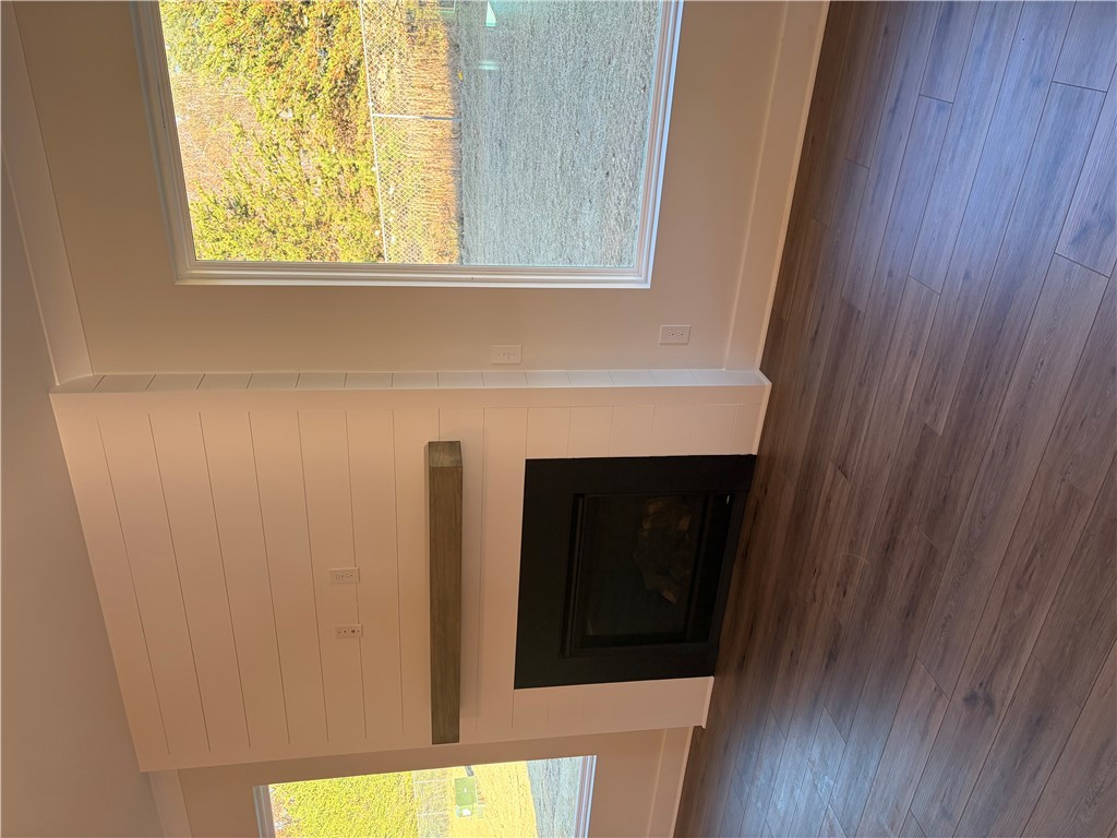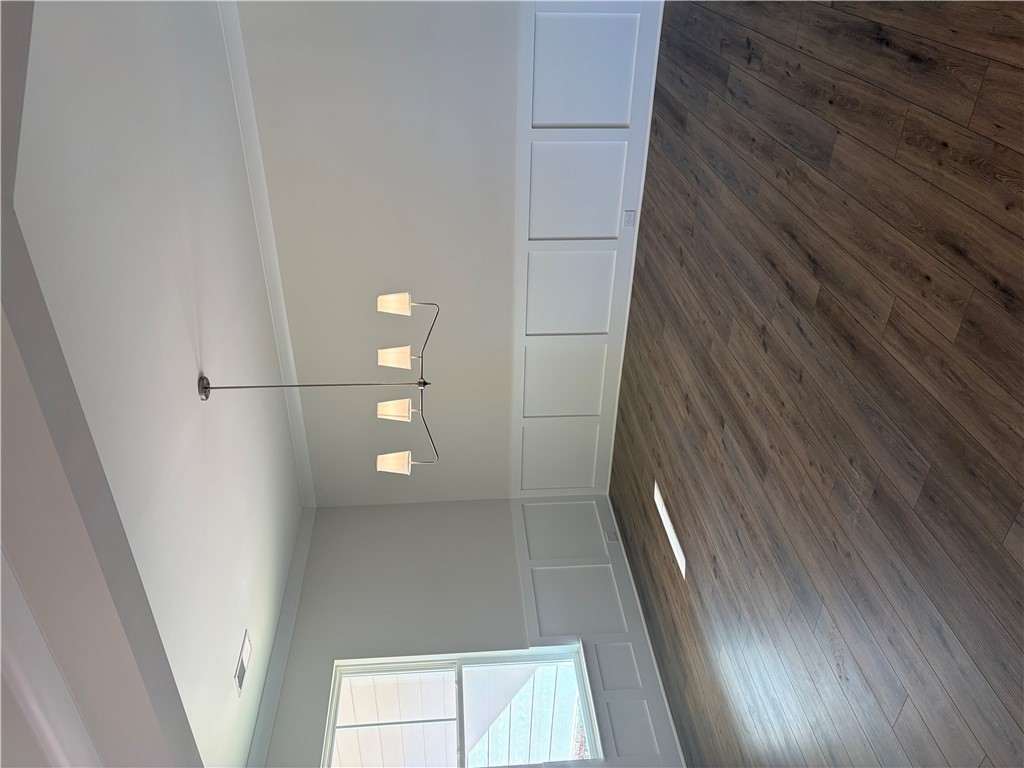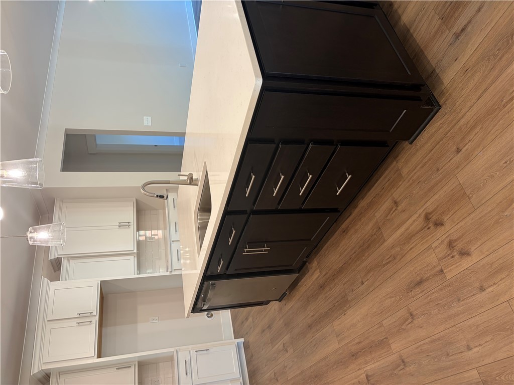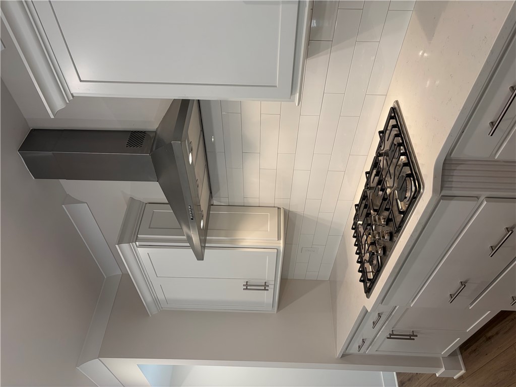 New construction Craftsman inspired home featuring 4 bedrooms, 3.5 bathrooms, and an open floor plan. The main level includes a foyer, formal dining room, and a kitchen with upgraded cabinetry, quartz countertops, built-in chimney hood, gas cooktop, and built-in microwave/oven combo. The kitchen opens to an informal dining area and a family room with a shiplap fireplace. Covered back patio provides outdoor living space. Split bedroom layout on the first floor includes a private primary suite at the rear of the home. Primary bath includes a tiled walk-in shower and garden tub. Additional first-floor features include a home office and laundry room. The second floor offers a loft area, one additional bedroom, and a full bathroom. All secondary bathrooms feature upgraded finishes. Home includes a built-in pest control system. Garage is finished with drywall, paint, electrical outlets, and lighting.