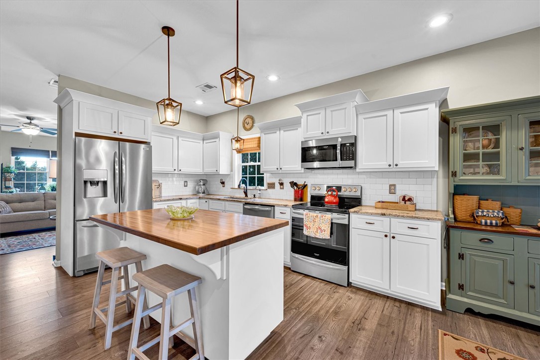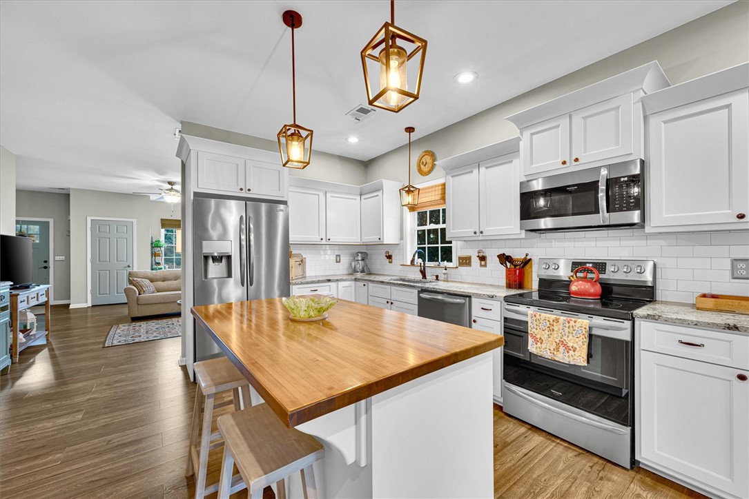 Welcome to Golden Springs! This beautifully maintained 3-bedroom, 2-bath home in the heart of Liberty is truly better than new construction. Featuring an open floor plan and a spacious eat-in kitchen, recent upgrades include a kitchen island, granite countertops, stylish backsplash, and updated lighting. Enjoy outdoor living with a fenced backyard, extended patio with roof, and an outbuilding with newer siding and electric. Additional improvements include newer windows, front and back doors, gas heat and air, and updated window treatments. Pride of ownership shines throughout—this one is not a drive-by! Schedule your showing today. Back on the market due to no fault of the seller.