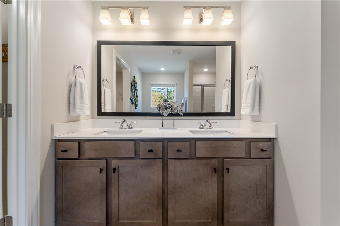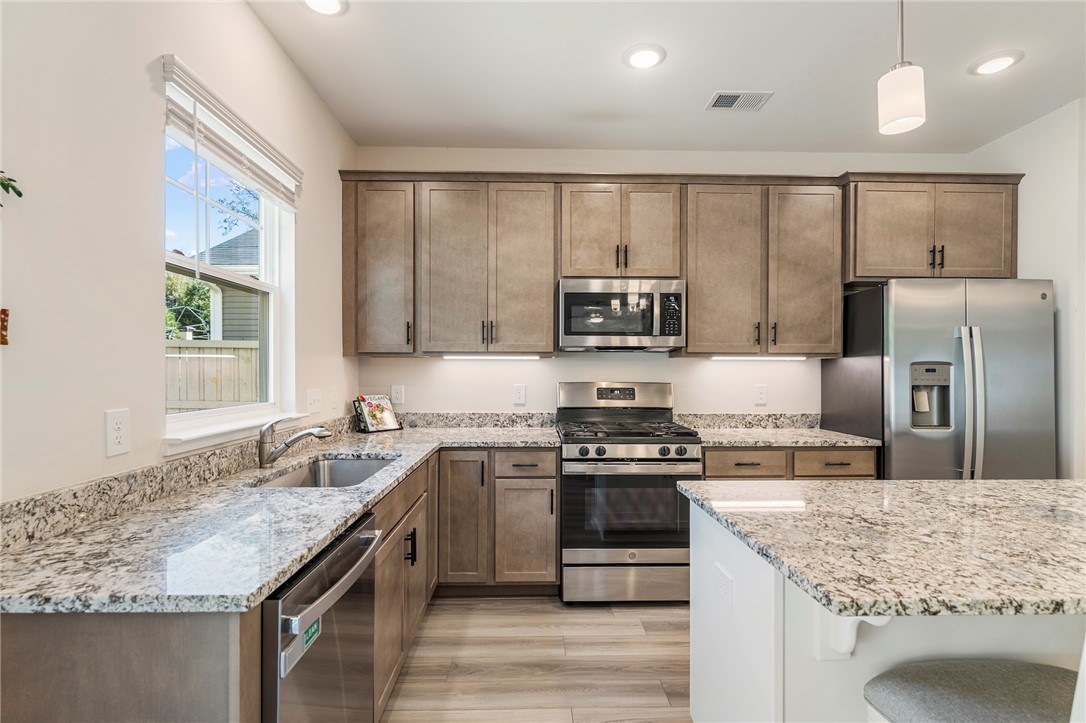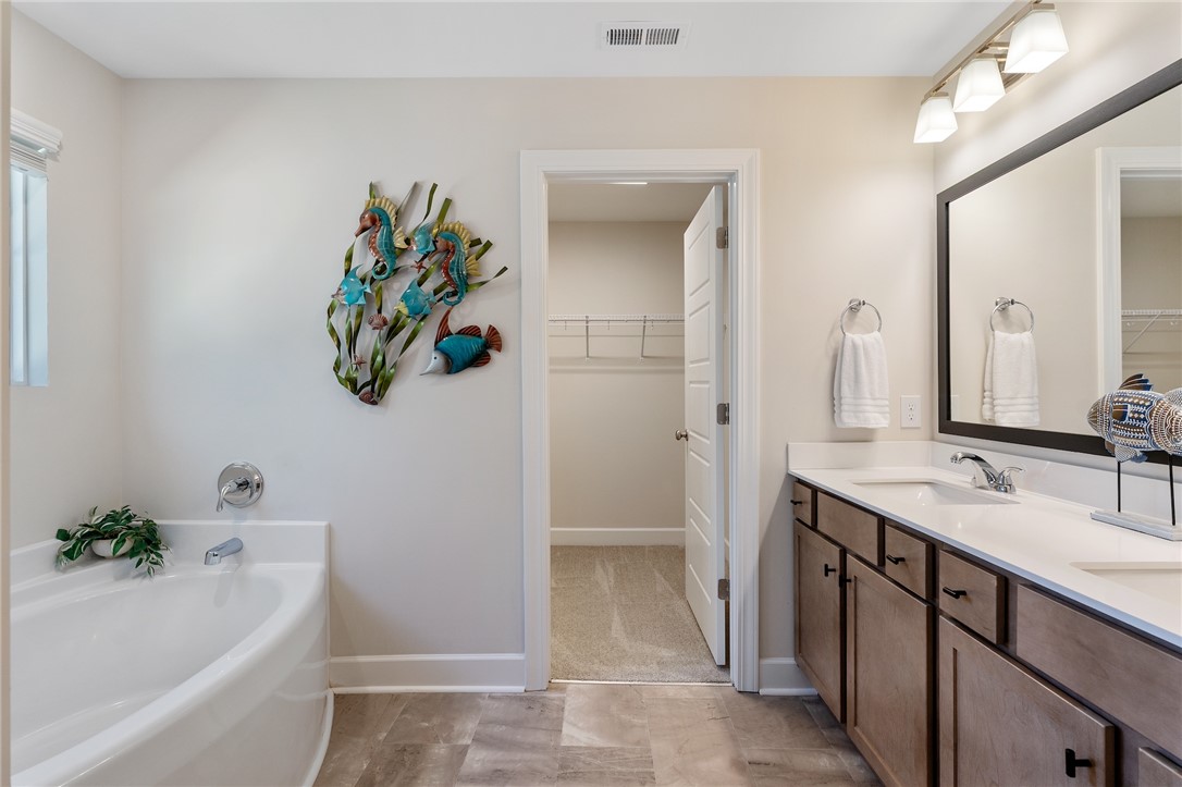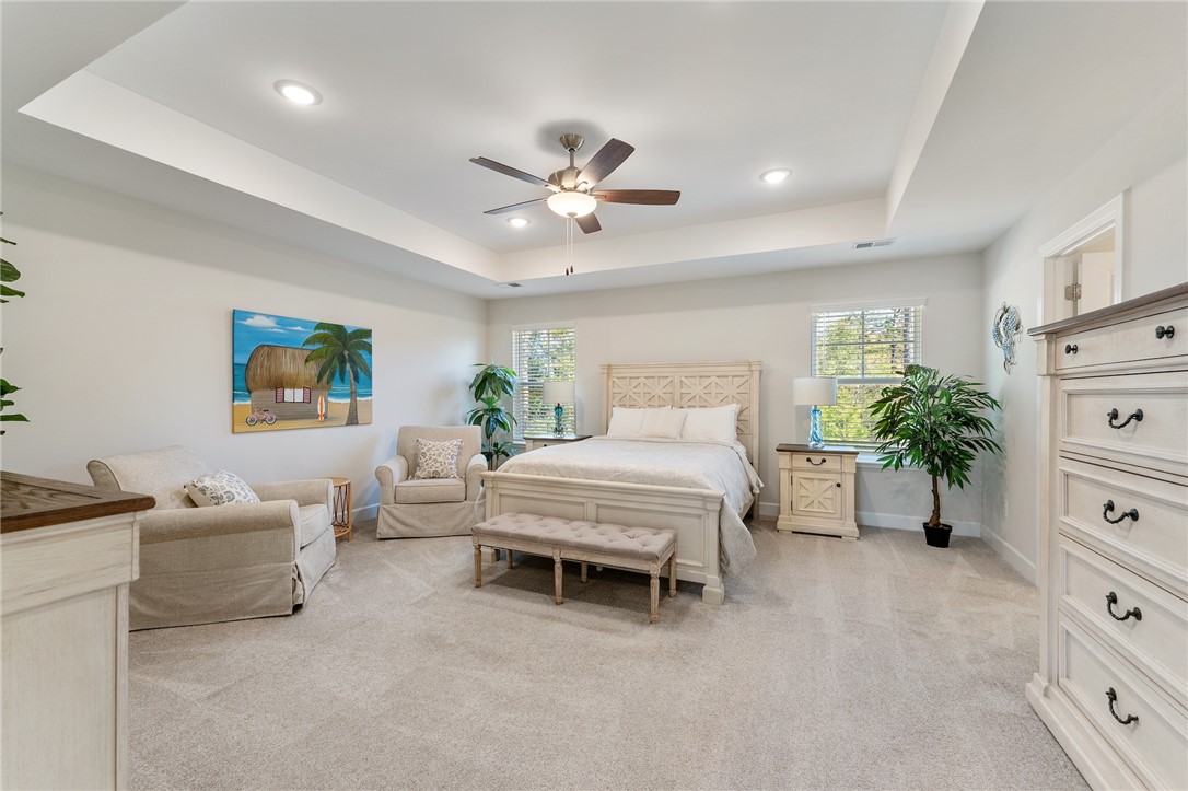 Discover this beautifully designed Monterey-style home in Holly Ridge, offering the perfect blend of custom-curated finishes, modern comfort, and serene natural surroundings. With 3 bedrooms, 2.5 baths, and approximately 2,200 sq. ft., this spacious home sits on a beautifully landscaped lot with a wooded backyard—a peaceful retreat where you can relax on the patio or lounge chairs and enjoy visits from forest wildlife. Step inside to an open, light-filled floor plan with abundant windows and thoughtfully selected details throughout. The elegantly appointed kitchen features shaker-style York Drift–stained cabinetry, Biscotti White granite countertops, a large center island, matte black hardware, under-cabinet LED lighting, and all stainless GE appliances, including a gas range—perfect for cooking and entertaining. Another awesome feature is that all appliances will convey, including the fridge, washer, and dryer so it's move in ready!! Flowing seamlessly from the kitchen, the dining room opens into an inviting living room creating a warm and welcoming atmosphere. The first floor also offers a versatile bonus room/home office, ideal for a Zoom Room, or creative studio, along with a convenient half bath. Upstairs, all three bedrooms are thoughtfully located along with the laundry room for ultimate convenience. The spacious owner’s suite features a tray ceiling, LED lighting, ceiling fan, a grand walk-in closet, and a luxurious en-suite bath with a walk-in shower, separate soaking tub, and a double-sink vanity. A cozy second-floor loft adds even more flexible living space—perfect for a TV den, reading nook, or relaxation retreat. Throughout the home, you’ll find stunning 5” wide Polaris Lighthouse luxury vinyl plank flooring in the main living areas and plush Shaw carpet in the bedrooms and loft. Step outside to your private patio just off the dining room, ideal for outdoor meals and quiet evenings under the stars. Located in a wonderful community with a pool and walking trails, this home offers beauty, comfort, and convenience—all in a prime Holly Ridge location.