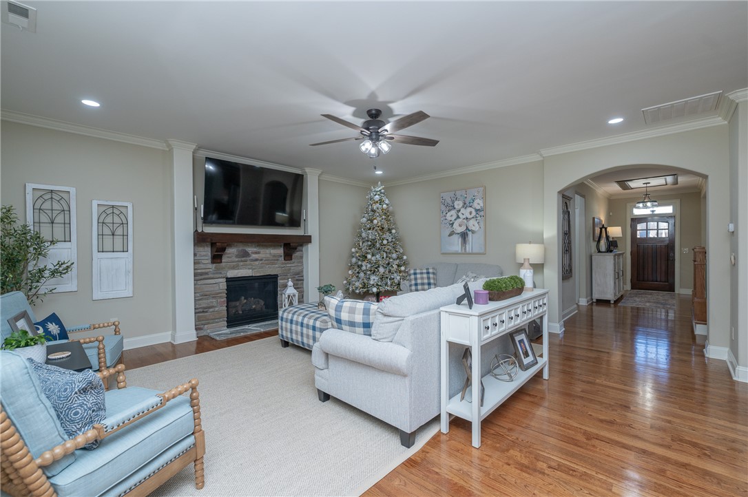 Meticulously maintained home in the highly sought after Courtyards at West Georgia Road! From the moment you arrive, the welcoming frontporch sets the tone. Step inside to a stunning foyer and an elegant dining room to your left, complete with a beautiful coffered ceiling. The mainlevel offers a spacious primary suite plus an additional bedroom and full bath perfect for guests! The large laundry room includes a sink,abundant cabinetry, and brand new ceramic tile floors! The primary suite features new hardwood flooring and an impressive walk-in closet.Upstairs you will find a generous bonus/loft area, two additional bedrooms, full bath, and a cozy office/flex space. Don't miss the expansive walk-in attic, providing exceptional storage options. The beautiful maintenance free screened porch overlooks the custom cobblestone patio andfirepit perfect for entertaining and relaxing!!! Homes in this much sought after community do not last ~ hurry before it's too late!!!