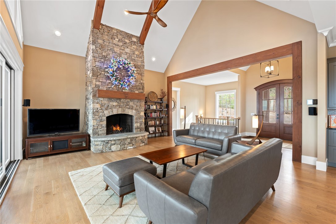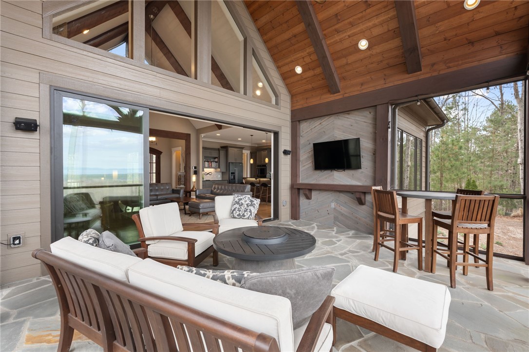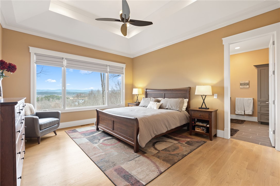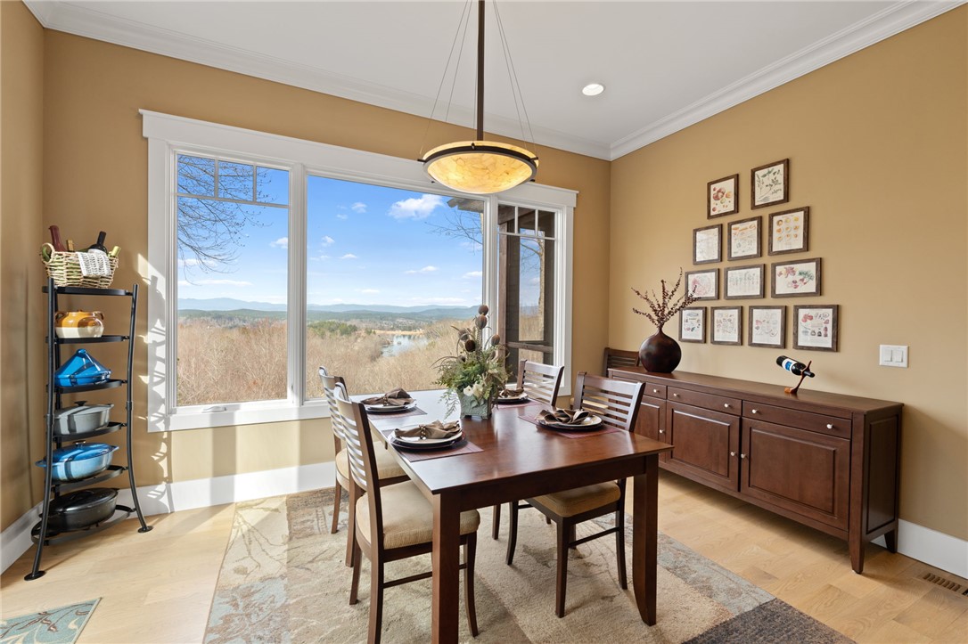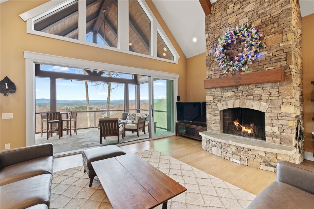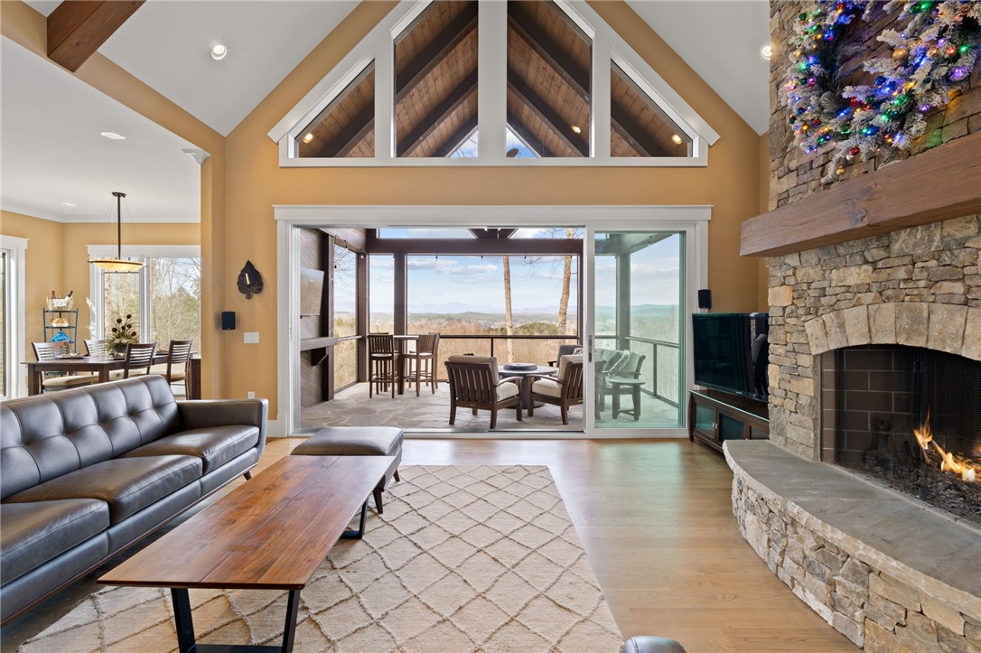 Picturesque mountain rustic home in the Cliffs of Keowee Springs combines a private wooded setting with captivating mountain and lake views from nearly every room. Built by Hillcrest Homes, the home sits on two lots totaling over five acres in The Cliffs at Keowee Springs. This property is ideal as a primary residence for a small family or an exceptional getaway retreat. The main level includes a great room, kitchen, dining area, primary bedroom suite, and powder room with site-finished, white oak hardwood flooring throughout. The open concept great room features vaulted ceilings, a dramatic stacked stone fireplace and clerestory windows that fill the space with natural light. Panoramic sliding doors open to a spacious screened porch with natural flagstone flooring, creating a seamless connection to outdoor living. The kitchen is well appointed with black stainless steel appliances, double ovens, a gas cooktop, and a generous island with breakfast bar. Just off the adjacent dining area, a flagstone patio offers the perfect place to enjoy a fire or sip morning coffee. The primary bedroom is a private retreat with panoramic views. The en suite bathroom offers dual vanities, a walk-in shower, and a separate water closet. The spacious walk-in closet includes custom shelving along with a window seat. The laundry room is conveniently located adjacent to the primary bedroom. The lower level walkout is thoughtfully designed to accommodate family and guests and also offers long-range mountain views from every window. A multipurpose recreation area includes a wet bar with a wine chiller and built-in cabinetry. Two bedrooms are located on this level, allowing one to be easily used as a home office, along with one full bathroom. An unfinished storage area provides a generous amount of additional storage space. This home is just minutes from the front gate and clubhouse and is offered in pristine condition. It presents an outstanding opportunity for those looking to downsize while continuing to enjoy the benefits of a Cliffs membership. Membership privileges provide access to exceptional amenities across seven clubs throughout South and North Carolina, including award winning golf courses, fine dining, wellness centers, tennis and pickleball courts, and more.
