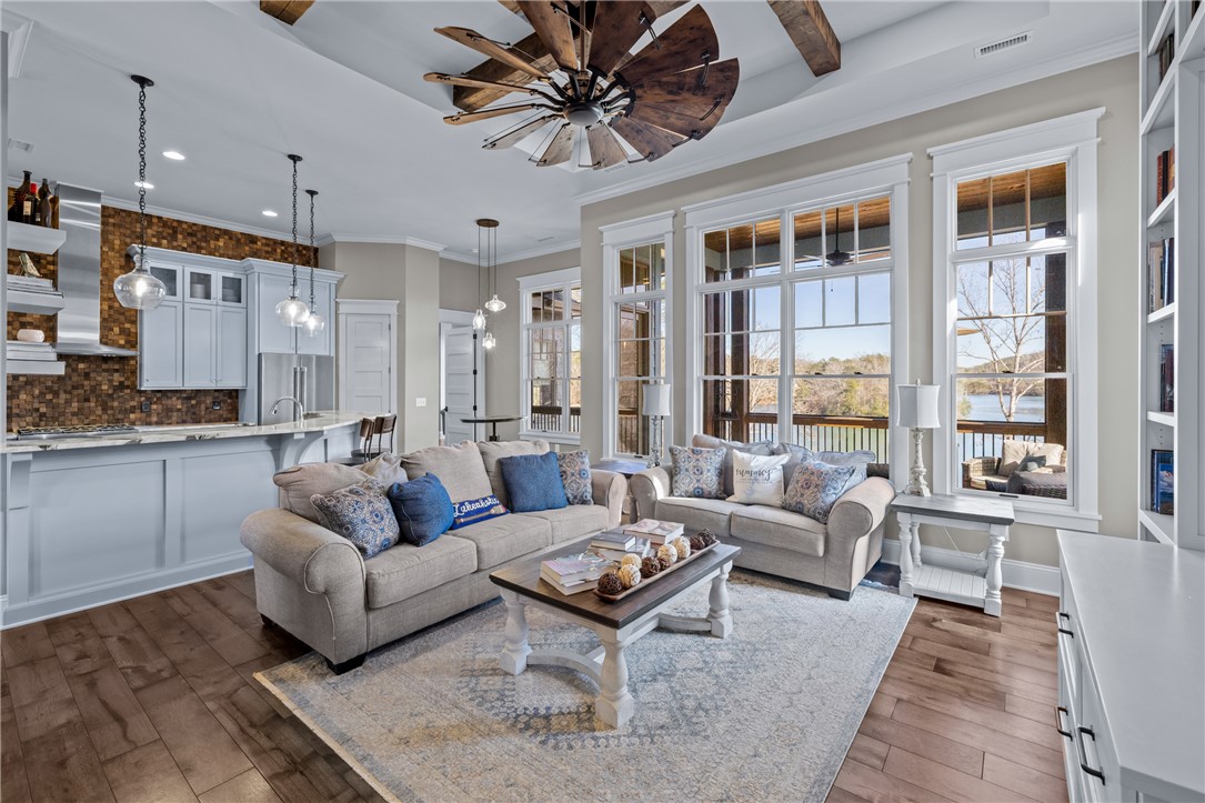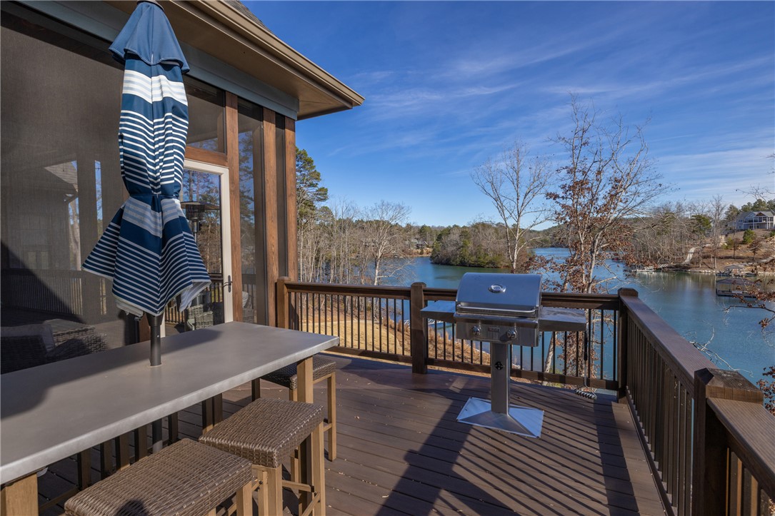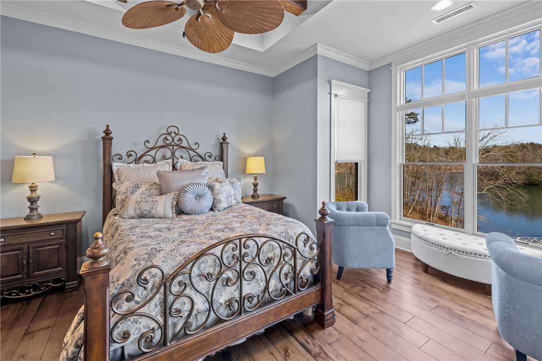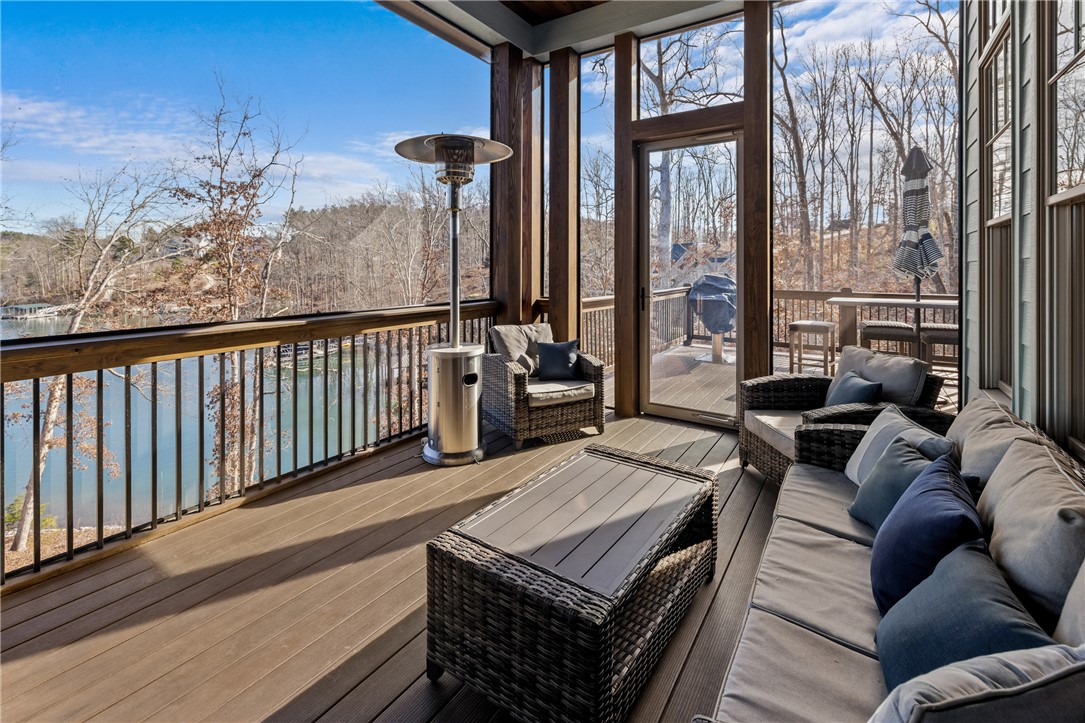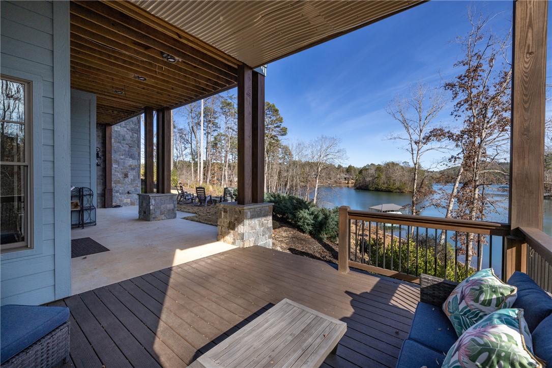 This newly (2022) and custom built, waterfront residence offers 4 bedrooms and 4.5 baths, along with a lake view office, a recreation room, and a bonus room. Nestled on 0.78 acres, the home sits in a peaceful cul-de-sac with approximately 211+/- feet of waterfront in a serene deep cove. Inside, you'll enjoy breathtaking lake views throughout the home, enhanced by 12-foot ceilings. The gourmet kitchen features a gas range, quartz countertops, and a walk-in pantry. There's a dining option for each season, including a formal dining room, a cozy breakfast area, a screened porch, and an uncovered deck. The living room has architectural features including a coffered beam ceiling, a dual-sided fireplace, built-in bookcases, and stunning lake views. The main floor includes a guest bedroom, an office, a laundry room, and a powder room. The luxurious main level primary suite boasts dual sinks, a garden tub, a tile shower, multiple closets, and a bay window sitting area perfect for enjoying lake views and deck access. The lower level offers two additional bedrooms, a recreation area, a full second kitchen, a second laundry room, and a covered porch area. This level provides gentle access to the lake, leading to a covered 26X30 dock in a deep-water cove, equipped with power, water, a boat lift, and 2 PWC ports. Ample storage is available with a two-car garage, lower-level mechanical storage with an additional storage area, a floored attic, and closets with built-ins throughout. Located in a gated community that allows short-term rentals with a minimum stay of three days, this home is conveniently near Sunset Marina by water and offers quick access to Clemson, Seneca, and Greenville by land.