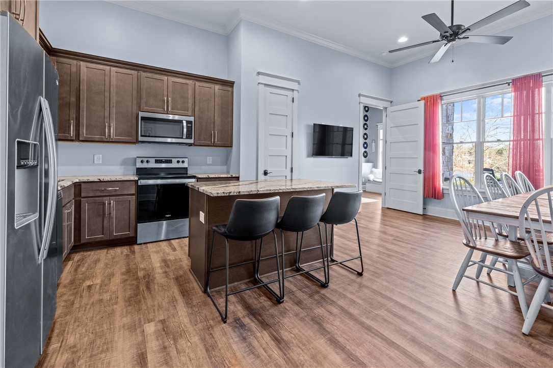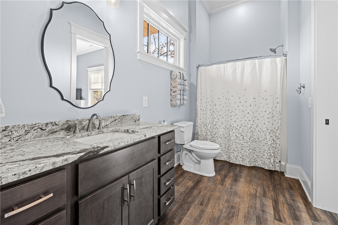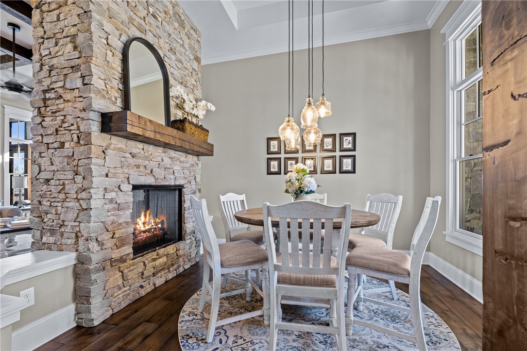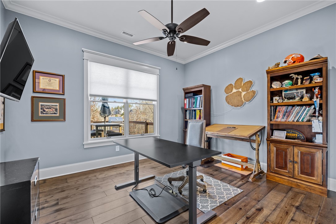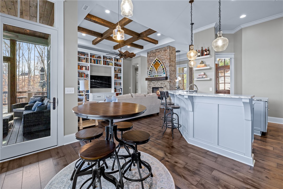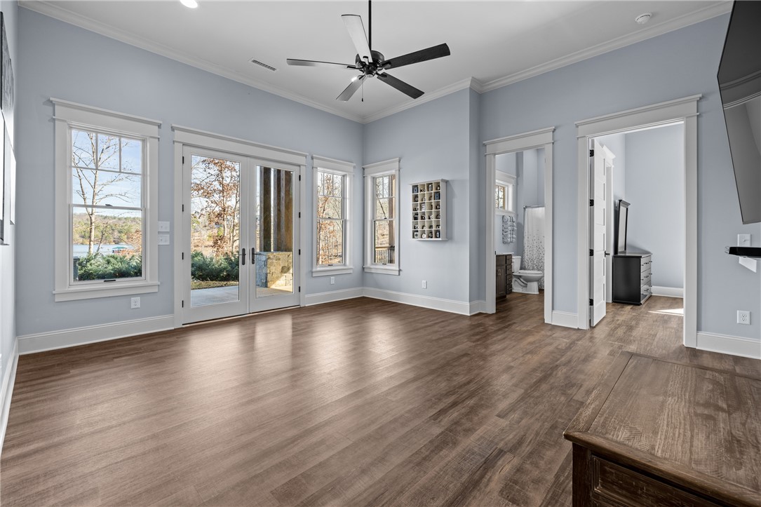 This newly (2022) and custom built, waterfront residence offers 4 bedrooms and 4.5 baths, along with a lake view office, a recreation room, and a bonus room. Nestled on 0.78 acres, the home sits in a peaceful cul-de-sac with approximately 211+/- feet of waterfront in a serene deep cove. Inside, you'll enjoy breathtaking lake views throughout the home, enhanced by 12-foot ceilings. The gourmet kitchen features a gas range, quartz countertops, and a walk-in pantry. There's a dining option for each season, including a formal dining room, a cozy breakfast area, a screened porch, and an uncovered deck. The living room has architectural features including a coffered beam ceiling, a dual-sided fireplace, built-in bookcases, and stunning lake views. The main floor includes a guest bedroom, an office, a laundry room, and a powder room. The luxurious main level primary suite boasts dual sinks, a garden tub, a tile shower, multiple closets, and a bay window sitting area perfect for enjoying lake views and deck access. The lower level offers two additional bedrooms, a recreation area, a full second kitchen, a second laundry room, and a covered porch area. This level provides gentle access to the lake, leading to a covered 26X30 dock in a deep-water cove, equipped with power, water, a boat lift, and 2 PWC ports. Ample storage is available with a two-car garage, lower-level mechanical storage with an additional storage area, a floored attic, and closets with built-ins throughout. Located in a gated community that allows short-term rentals with a minimum stay of three days, this home is conveniently near Sunset Marina by water and offers quick access to Clemson, Seneca, and Greenville by land.