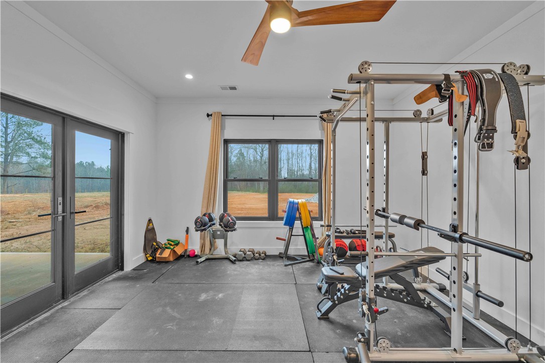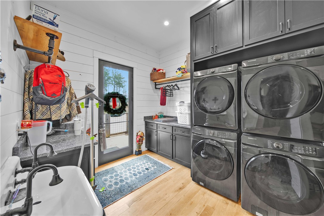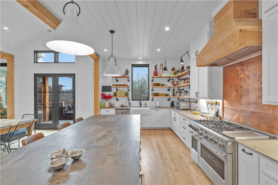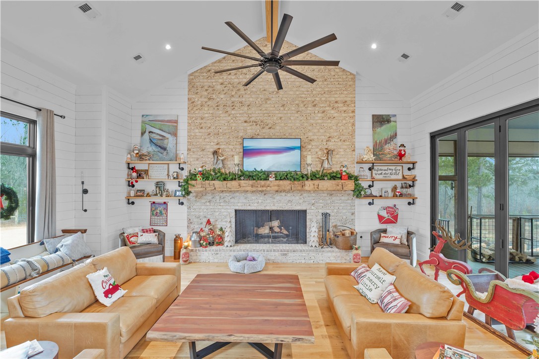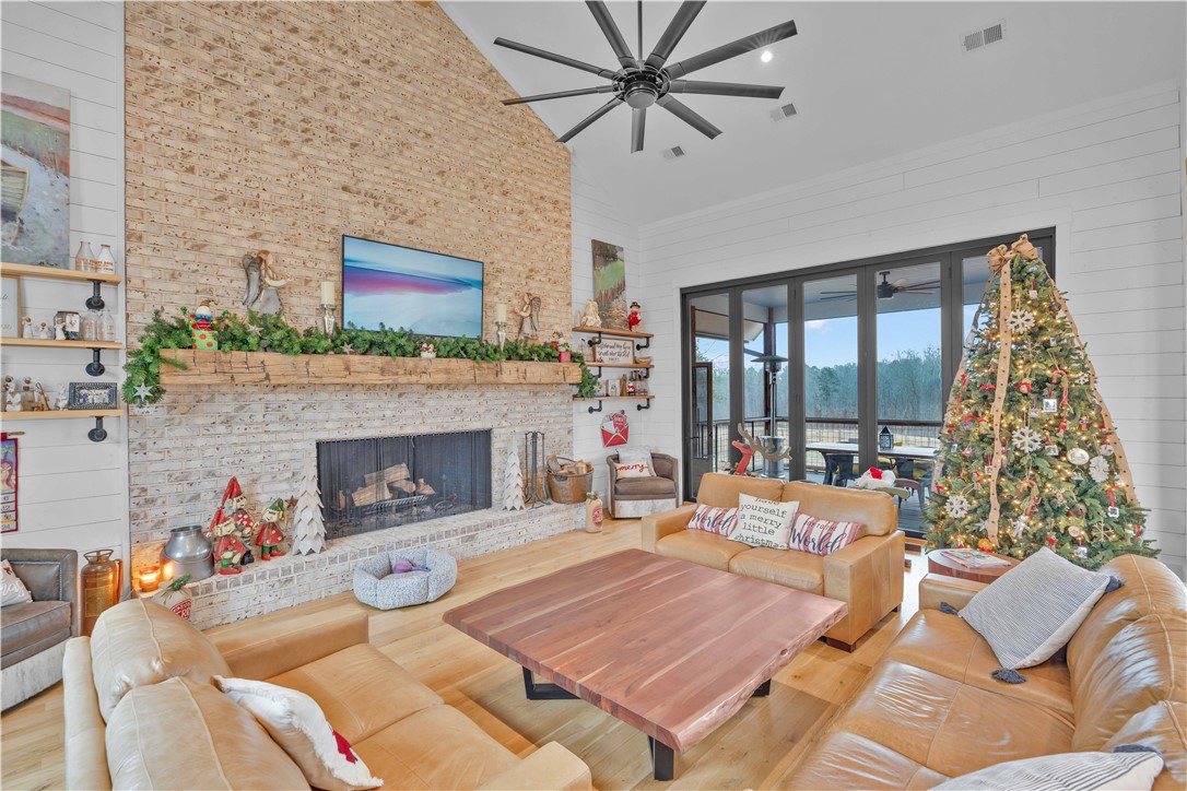 LITTLE RIVER FARMS | Move-in-ready new construction on a ±157-acre turnkey livestock and recreational farm in Laurens, SC. | This serene estate spans approximately 157 acres and features a 6-bedroom, 6.5-bath custom home surrounded by fenced pastureland, exceptional recreational amenities, and abundant natural beauty. The property includes a large pole building with a finished apartment, multiple equipment barns, a chicken coop with predator-proof netting, and over 2,000 fruit and nut trees. Excellent hunting opportunities abound, including deer, turkey, ducks, and small game. The Little River flows directly through the heart of the farm, offering a reliable water source and a natural wildlife travel corridor. The private residence offers 6 bedrooms and 6.5 baths with thoughtfully designed living spaces throughout. Highlights include vaulted ceilings, white oak hardwood floors, seamless open-concept living, an immaculate chef's kitchen, a main-level primary suite, a fully finished basement with multiple entertaining areas, and a spacious mudroom/laundry room. The chef's kitchen is outfitted with a large island with bar seating, walk-in pantry, commercial-grade appliances, copper backsplash, wood-accented range hood, and open mahogany shelving. The tranquil primary suite features a spa-like bath with a four-head shower and a stunning Native Trials soaking tub. Entry from the 2-car garage leads into a highly functional mudroom complete with coat racks, a custom rainbow poplar bench, sink, and laundry area with two sets of washers and dryers. Upstairs, you'll find 3 generously sized bedrooms, each with excellent closet space and a private ensuite bath. The fully finished basement offers 2 additional bedrooms with full baths, a great room/rec room, a kitchen and entertainment area with a four-seat island and granite countertops, a flex room currently used as a media room, and walk-in access to the HVAC system, Rinnai tankless water heaters, and electrical panel. A wall of windows across the rear of the home fills the living spaces with natural light and showcases peaceful views of the surrounding livestock pastures. Outdoor living is equally inviting, with both a screened porch and an open deck offering ample space for seating and grilling. Enjoy the perfect balance of privacy and convenience, all within minutes to downtown Laurens, shopping, and medical facilities, with easy access to I-385 and approximately 45 minutes to downtown Greenville.