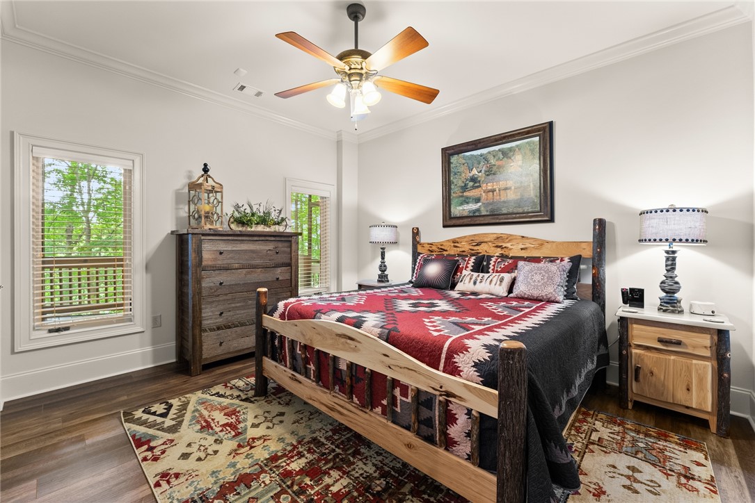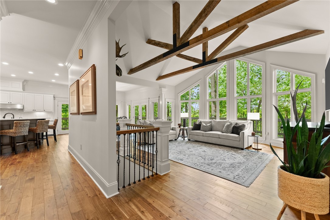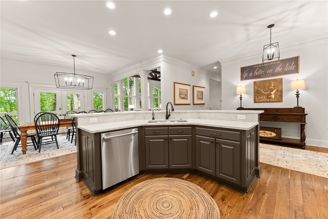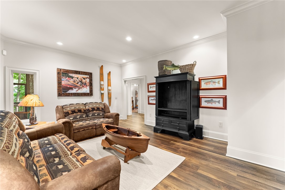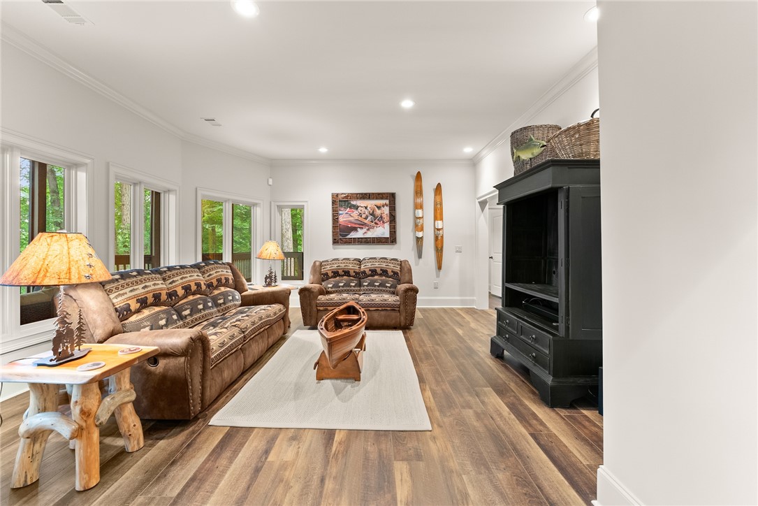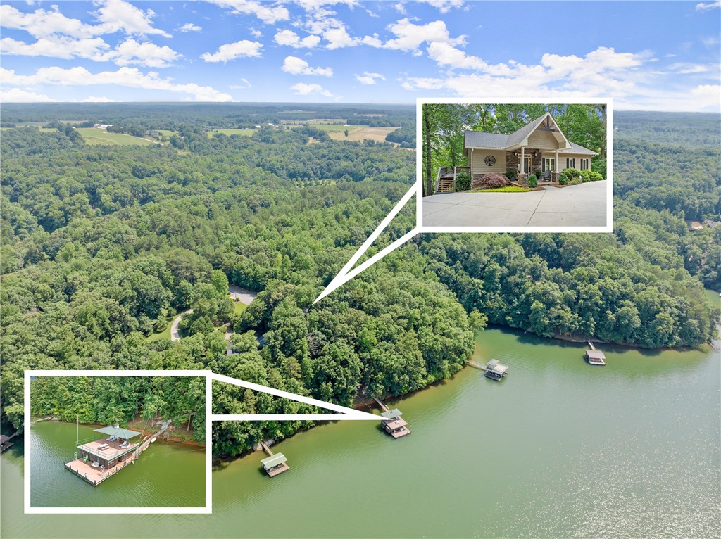 STUNNING, CUSTOM BUILT LAKE FRONT HOME ON DEEP WATER with incredible views of Lake Hartwell is located on a private wooded cul-de-sac. All are sure to relish in the open concept kitchen, dining and living areas. This chef’s kitchen features exquisite designer selections that include quartzite counters, stainless steel appliances - including a Wolf cooktop, acacia hardwood floors, pantry and massive island that is perfect for entertaining. With large, expansive windows throughout, gorgeous light-filled views as well as deck access for dining al fresco, allows for stunning scenery year-round! The flow of the home is seamless as you enter the living room, to include deep vaulted ceilings with rustic, yet sophisticated beam accents. The extra touch of 10' ceilings and extensive molding only enhance the appeal of this dreamy property! The oversized Owner's Suite is located on the main level and includes coffered ceilings, water views with deck access and full en suite bath. The well appointed additional bedroom on the main level and full bath are perfect for family and guests to round off the first floor. As you venture downstairs you will most definitely delight in the spacious, yet cozy additional living area, kitchen, laundry, three bedrooms (two are flex spaces without windows) and two full baths! You will be thrilled with the easy access right onto the covered and screened lower deck - perfectly positioned for additional gathering with friends and family! The backyard golf cart/walking path allows access to your very own dock (Full size dock -largest dock size permitted on Lake Hartwell) with roof top!. This property feels like a lake-getaway dream, yet is still convenient to Clemson University, Anderson, Seneca and I-85. Schedule your showing today, as this breathtaking lakefront property oasis will not be on the market long! **ALL FURNITURE & ADDITIONAL ITEMS IN HOME TO CONVEY**
