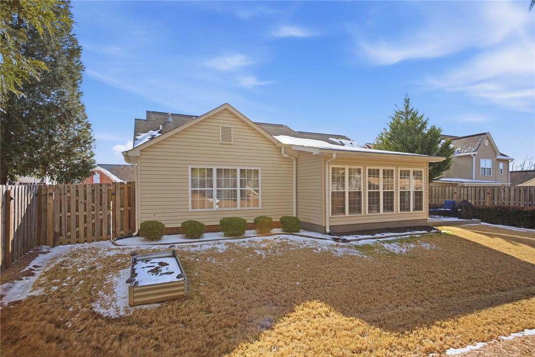 Located in the desirable Oaks at Rock Springs, this move-in-ready, one and a half level home offers 3 bedrooms, 2 baths, a cozy heated and cooled sunroom PLUS a bonus room above the garage. The floor plan features a spacious living room with a gas log stone fireplace, updated flooring, and a formal dining room with a tray ceiling. Several rooms have been freshly painted, giving the home a bright, updated feel. The primary suite has a tastefully remodeled bathroom with double vanities, a walk-in closet, and a separate tub and shower, while the hall bath has beautiful ivory marble. Built in 2005, the home also includes a roof installed in 2012, an electric heat pump HVAC system installed in 2020, public water and sewer, and attractive landscaping with great curb appeal. The backyard is fenced-in. The community HOA includes a pool with annual dues of $438, and the home is conveniently located near shopping, dining, medical facilities, entertainment, interstate access, and the airport.