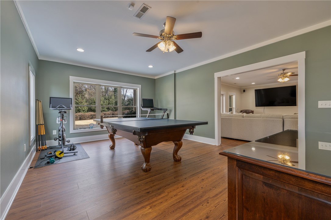 Set on a quiet cul-de-sac in Clarendon Hall, this custom all-brick home offers privacy, space, and thoughtful design on more than 1.4 acres - an exceptional setting in one of Clemson’s premier neighborhoods. The main level is open and inviting, featuring a beam accented living area and a well-designed kitchen suited for both everyday living and entertaining, complete with a large island with prep sink, professional gas cooktop, double wall ovens, granite countertops, and abundant custom cabinetry. Nearby supporting spaces are seamlessly integrated and include an oversized pantry, a laundry room with sink and folding station, and a mudroom with drop zone and workspace, conveniently located off the grilling deck. Indoor and outdoor living connect effortlessly through a screened porch overlooking the private backyard and expansive green space, which backs directly to Clemson’s community garden. The main-level primary suite offers a peaceful retreat with dual granite vanities, soaking tub, tiled shower, and a spacious walk-in closet. Also on the main level is a bright office that easily functions as a flex space, playroom, or additional living area, along with a guest half bath. Upstairs, a central loft-style nook provides flexible space for work or gathering, surrounded by three spacious bedrooms - two connected by a Jack-and-Jill bath and one with an en suite bath, all finished with granite counters and ample closet space. The walk-out lower level is filled with natural light and features new flooring throughout, a wet bar, large recreation area, guest suite with full bath, and an additional bonus room offering even more flexibility. Storage is abundant, with multiple mechanical rooms and a framed workshop with exterior access that lends itself well to future finishing, if desired. Additional highlights include a three car garage, circular driveway with generous parking, mature landscaping, and neighborhood amenities including a pool and clubhouse.