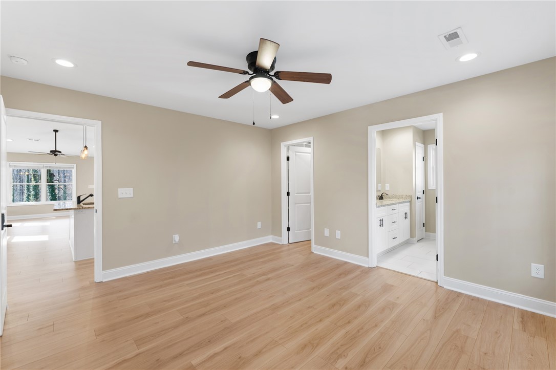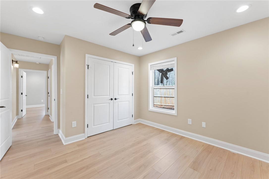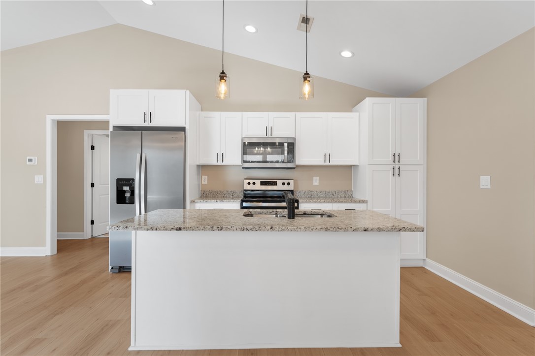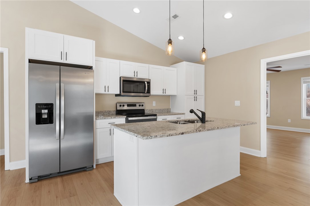 Two-year-old home situated on approximately .66 acres with a private wooded setting and long concrete driveway. Built in 2022, this home presents in like-new condition with modern finishes and an open layout. The main living area features vaulted ceilings, recessed lighting, ceiling fan, and durable plank flooring throughout. The kitchen includes white cabinetry, granite countertops, stainless steel appliances, pendant lighting, and a center island with bar seating. Open flow between kitchen and living space allows for flexible furniture placement and everyday functionality. Exterior features include a covered front porch, covered side parking area, and extended concrete driveway. The lot offers a wooded backdrop providing separation from neighboring properties while still being conveniently located near town.