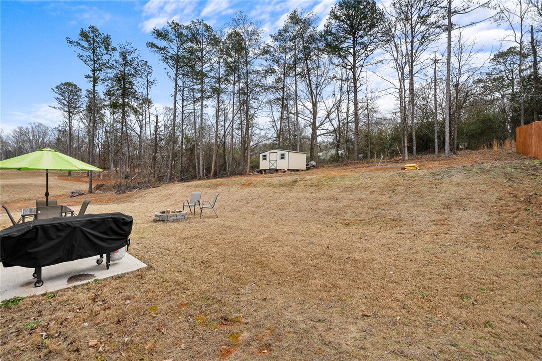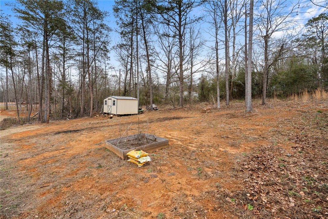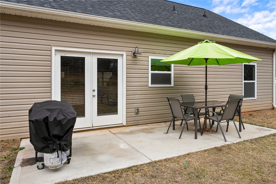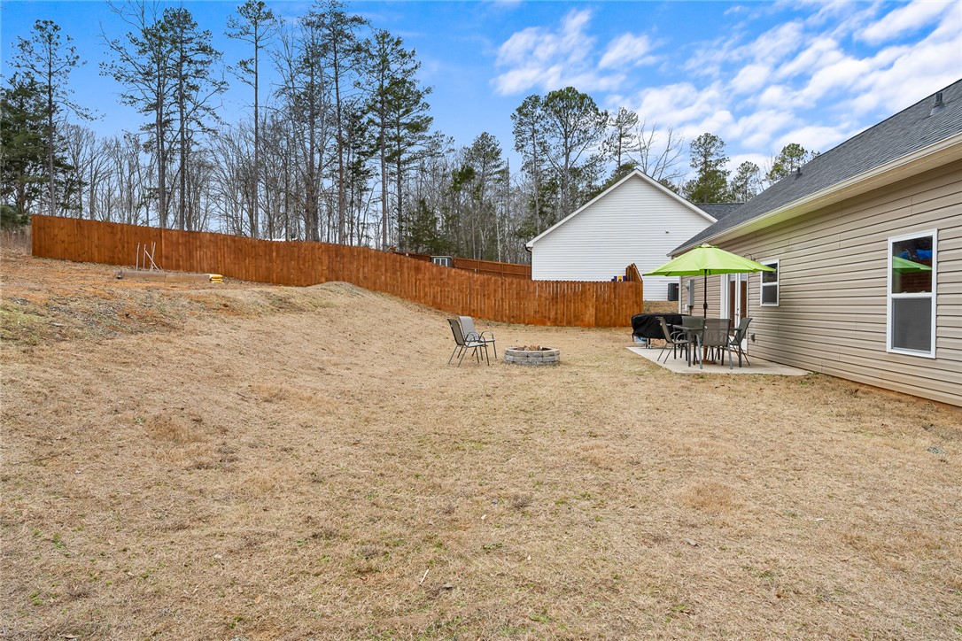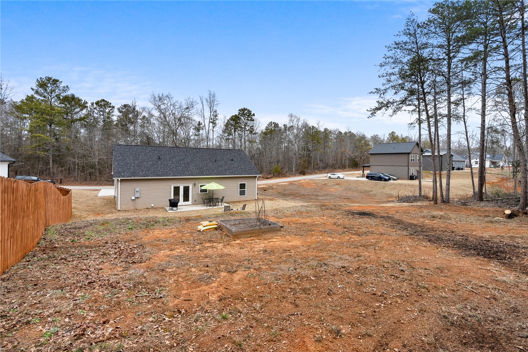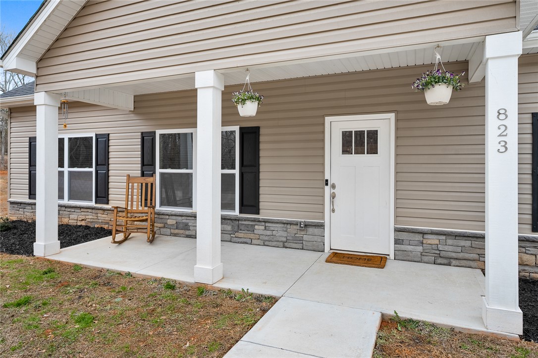 Welcome to easy living in the county! Built in 2023 and set on a spacious .51-acre lot, this move-in ready one-level home features the perfect blend of modern finishes and everyday functionality. Relax on the charming rocking-chair front porch, then step inside to discover luxury vinyl flooring throughout (no carpet anywhere) along with crown molding, added trim detail, fresh paint, and thoughtful upgrades that elevate the entire home. The kitchen features white cabinetry, granite countertops, and stainless steel appliances, opening naturally into the living and dining areas for comfortable living and entertaining. French doors lead to the back patio overlooking a private wooded backyard; ideal for morning coffee or evenings outdoors. The split floor plan provides privacy for the primary suite, complete with a full ensuite bath featuring double sinks, an oversized vanity with granite countertops, tub/shower combo, and a deep walk-in closet. Two additional bedrooms share a full bath, while the oversized laundry room offers flexible space and could easily be converted into a walk-in pantry storage or closet area. Outside, enjoy room to spread out plus an outbuilding for storage, or workshop space; all with the benefit of county living and no city restrictions. Modern construction, functional layout, upgraded finishes, only a 3 minute drive to Ingles Grocery Store, close to Legendary Green Pond Landing & Event Center and Jack's Landing Boat Ramp is only a four minute drive away— this home checks all the boxes.