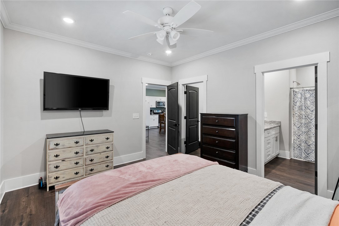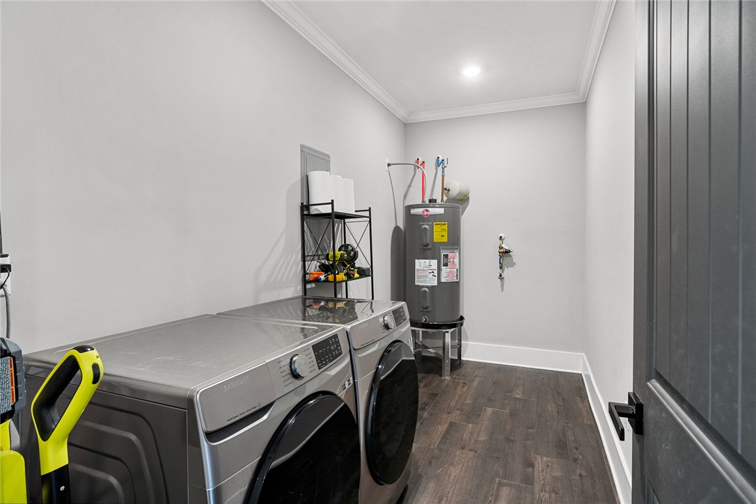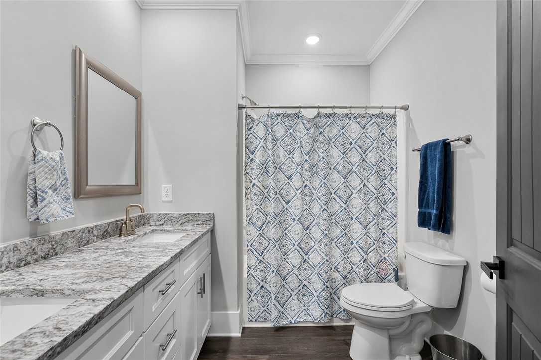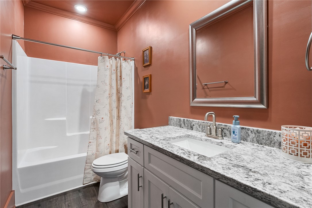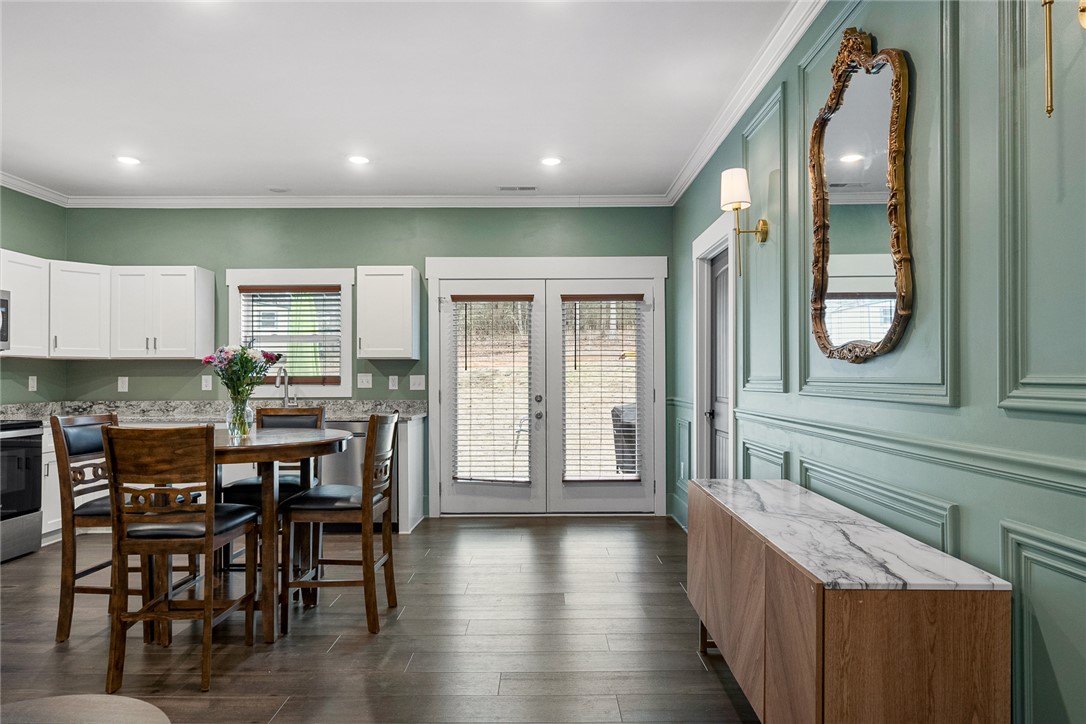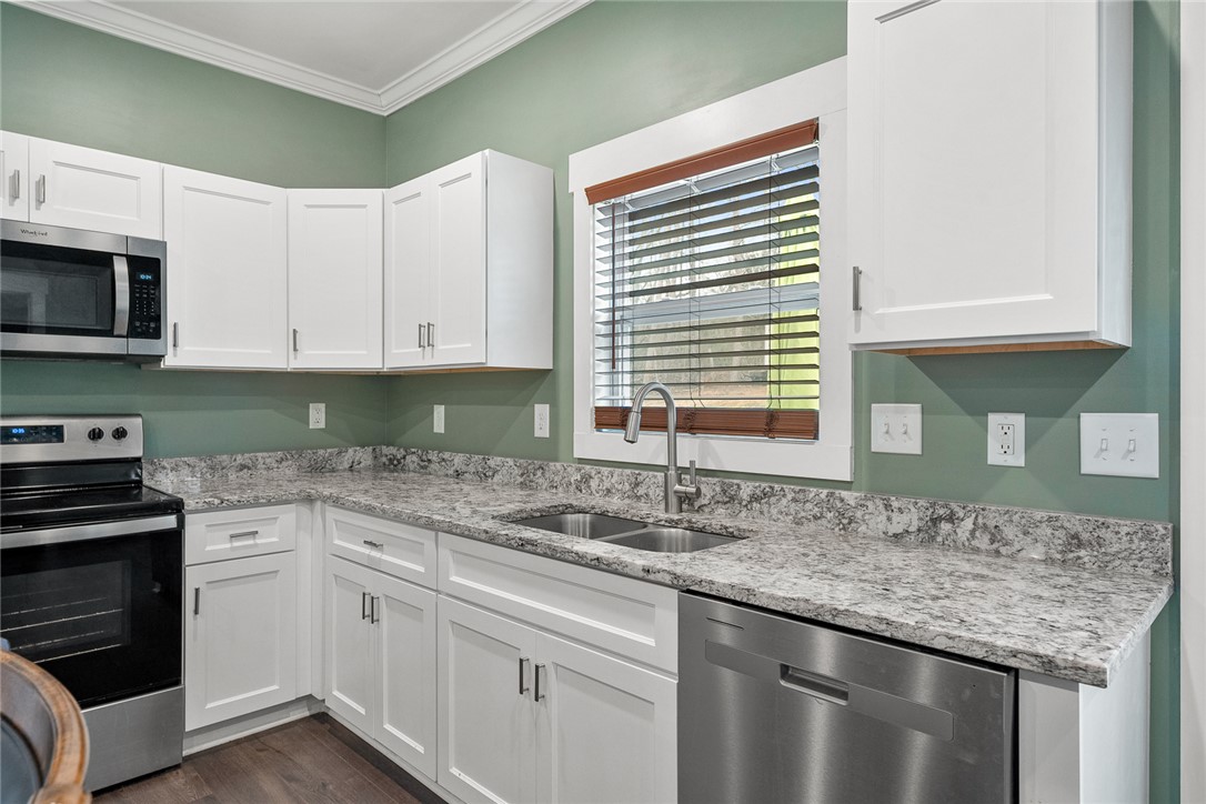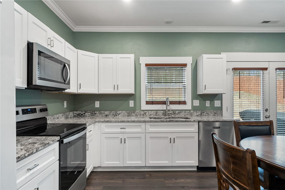 Welcome to easy living in the county! Built in 2023 and set on a spacious .51-acre lot, this move-in ready one-level home features the perfect blend of modern finishes and everyday functionality. Relax on the charming rocking-chair front porch, then step inside to discover luxury vinyl flooring throughout (no carpet anywhere) along with crown molding, added trim detail, fresh paint, and thoughtful upgrades that elevate the entire home. The kitchen features white cabinetry, granite countertops, and stainless steel appliances, opening naturally into the living and dining areas for comfortable living and entertaining. French doors lead to the back patio overlooking a private wooded backyard; ideal for morning coffee or evenings outdoors. The split floor plan provides privacy for the primary suite, complete with a full ensuite bath featuring double sinks, an oversized vanity with granite countertops, tub/shower combo, and a deep walk-in closet. Two additional bedrooms share a full bath, while the oversized laundry room offers flexible space and could easily be converted into a walk-in pantry storage or closet area. Outside, enjoy room to spread out plus an outbuilding for storage, or workshop space; all with the benefit of county living and no city restrictions. Modern construction, functional layout, upgraded finishes, only a 3 minute drive to Ingles Grocery Store, close to Legendary Green Pond Landing & Event Center and Jack's Landing Boat Ramp is only a four minute drive away— this home checks all the boxes.