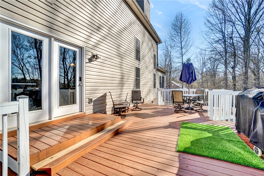 Stunning traditional home situated on nearly an acre in the heart of Dacusville! There is so much to love about 116 Faye Circle - a custom-built Schumacher Home completed in 2015. From the moment you arrive, you’ll fall in love with the exceptional curb appeal offered by this home, with a spacious front yard and a classic rocking chair worthy front porch. Step inside the impressive two-story foyer and immediately notice the open, airy floor plan filled with natural light. New flooring and fresh paint throughout the main level create a clean, cohesive, move-in-ready feel. Just off the foyer, you’ll find a formal dining room to the right and a flex room to the left — ideal for a home office, playroom, media room, or man cave. Continue into the inviting living room, where high ceilings and a wood-burning fireplace create a warm yet grand atmosphere. The living area flows seamlessly into the breakfast nook, kitchen, and access to the back patio, making it perfect for everyday living and entertaining. The beautifully updated kitchen features brand-new quartz countertops, a new tile backsplash, stainless steel appliances, abundant cabinetry, a designated pantry, and a center island ideal for meal prep or casual dining. Tucked away on the main level, the spacious primary suite is complete with a walk-in closet and a well-appointed ensuite bath featuring double vanities, a walk-in shower, soaking tub, and private water closet. Lastly on the main floor are a walk-in laundry room, powder room, and access to the oversized two-car garage. Upstairs, you’ll find three additional generously sized bedrooms, a full bathroom, and a versatile loft space perfect for a second living area, study zone, or workout space. And now for the showstopper - the backyard oasis. Step outside to your in-ground fiberglass saltwater pool and enjoy summer evenings grilling on the back deck or gathering around the fire pit beneath the gazebo. The mature tree line provides privacy and backs up to 30+ acres of peaceful pastureland, creating a serene and scenic backdrop. This home has been meticulously maintained, including new gutter guards installed in 2024, a new pool pump and control board, and consistent routine maintenance on all major systems. With nearly an acre of land, incredible outdoor living, thoughtful updates, and a charming neighborhood with NO HOA, this home truly offers the total package. Schedule your showing today!