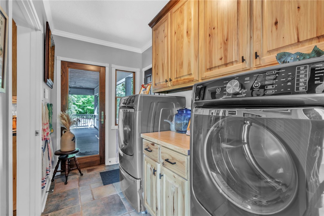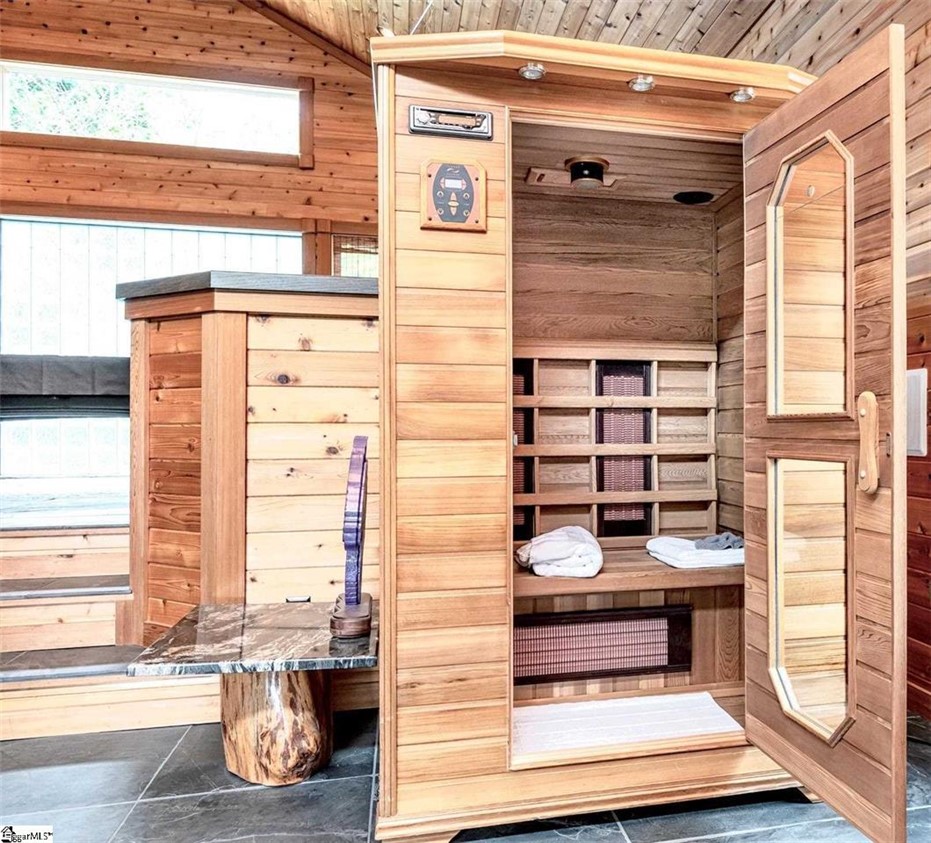 Custom built mountain retreat on 2.39 private acres with a pond and long range views of Table Rock, designed for full time living in a private setting with convenient access to town. Located just 20 minutes to Pickens, 30 minutes to Travelers Rest, and 45 minutes to Downtown Greenville, this property offers mountain serenity with practical proximity to everyday needs. Crafted by a master carpenter, the home showcases detailed workmanship throughout with hickory cabinetry, cedar walls, rock accented features, and a dramatic two-story stone fireplace that anchors the main living area. The kitchen offers generous eat in space, an island, farmhouse sink, and upgraded stainless appliances. Just behind the kitchen is the laundry area with built-in storage and direct access to the exterior deck, porch, and garage. The dining room features built-in cabinetry and direct access to the exterior porch, providing an additional setting for gatherings and everyday meals. A half bath is conveniently located near the entry of the home for guests. The main level primary suite serves as a comfortable retreat with dual vanities, walk in shower, walk in closet, and quality finishes. Upstairs includes two loft areas featuring custom wood details and built-in shelving, along with two well sized bedrooms and a spacious bath with clawfoot tub. One of the most distinctive features of the home is the separate entertainment and secondary living space. This area includes a built-in desk, billiard area, bar with mini refrigerator and bar sink, and a full bathroom, making it suitable for guests or potential use as a fourth bedroom. A few steps below is a large vaulted space with woodburning stove, sauna, and sitting area that leads directly to the expansive screened porch where the long range views of Table Rock are especially striking. The side entry four car garage includes built in cabinetry, wood countertops, sink, ceiling fans, car runners, and finished flooring. Above the garage, accessed from the exterior rear deck and stairs, is a finished two room space with closets and charming electric fireplaces in each room. While not heated and cooled, it offers excellent flexibility for office, studio, recreation, or future conversion potential. Outdoor living is thoughtfully designed with a wraparound porch, oversized stone courtyard and patio, detached storage shed, and additional storage beneath the covered patio. The encapsulated crawlspace enhances long term structural performance, and reliable internet access supports remote work and modern connectivity in a mountain setting. This property blends craftsmanship, versatility, and privacy, creating a primary residence opportunity surrounded by natural beauty and views of Table Rock in the Upstate.