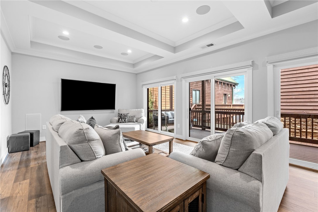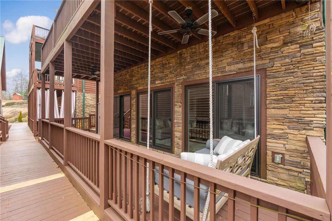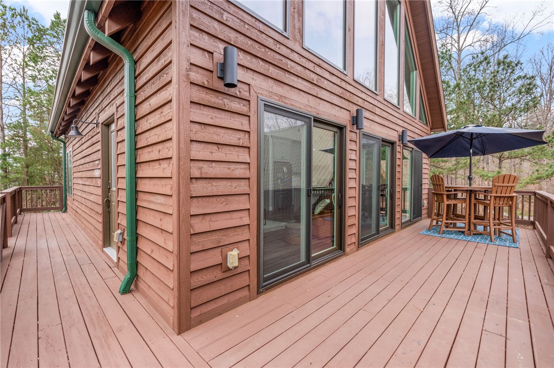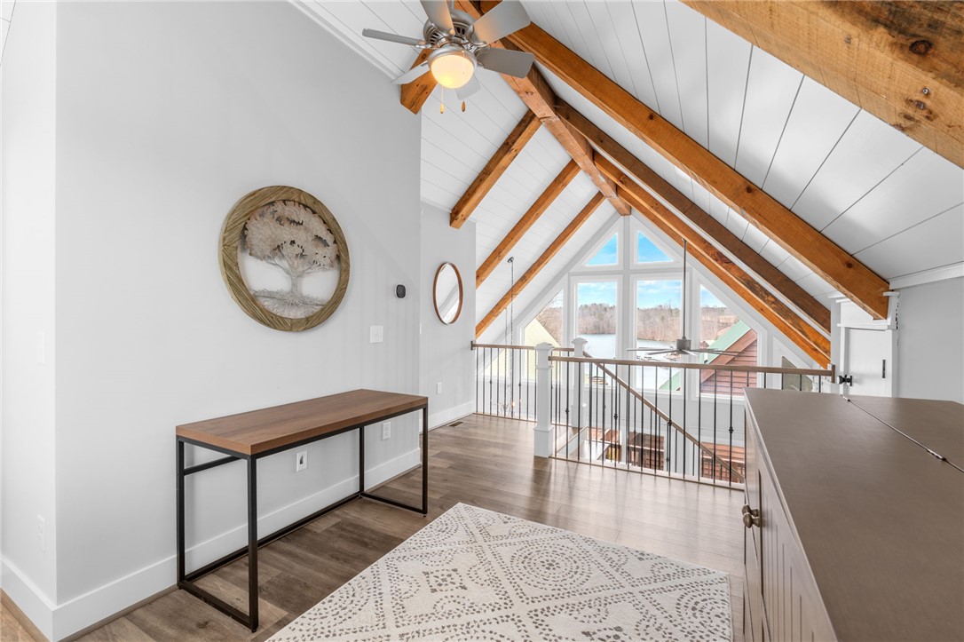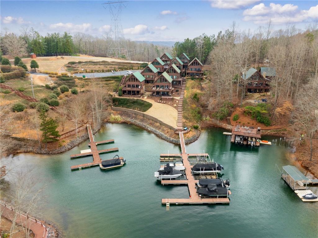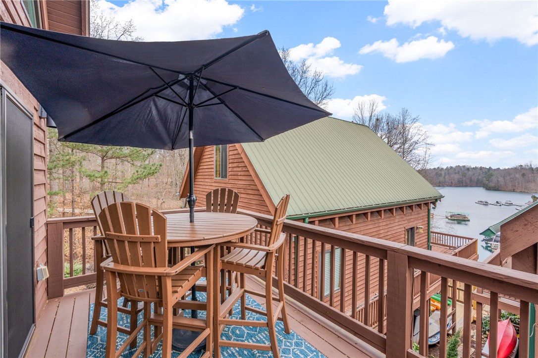 Stunning A-frame waterfront home located in a deep-water cove on Lake Keowee, showcasing the pristine emerald water and beautiful views of the Blue Ridge Mountains. Includes deeded boat slip (#8) with jet ski storage lift in place just steps away. The main level features an open floor plan with exposed wood beams, soaring cathedral windows, gas fireplace, luxury LVT flooring, and a kitchen with granite countertops and stainless appliances. Spacious primary suite on main with private bath. Upper loft bedroom includes its own full bath. Walk-out lower level offers room for 85” TV with built-in surround sound, two additional bedrooms, and a shared full bath. Both main and lower levels feature new Alta motorized blackout shades. Enjoy full-width decks on both levels plus a stone patio with brand-new 65” TV and gas fire pit — perfect for entertaining. Also included in this price is a buildable lot with deeded boat slip (#7). All furniture and hot tub negotiable with purchase. Rentals not allowed per HOA. Ideal for full-time living or a lake retreat — this one is a must-see.