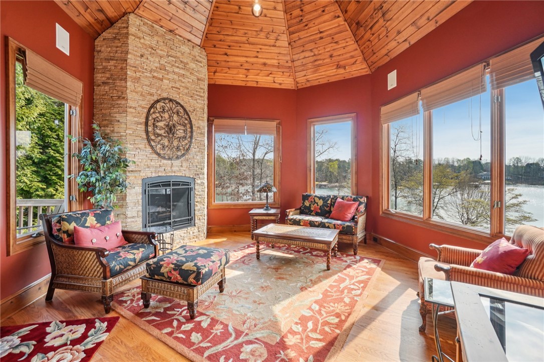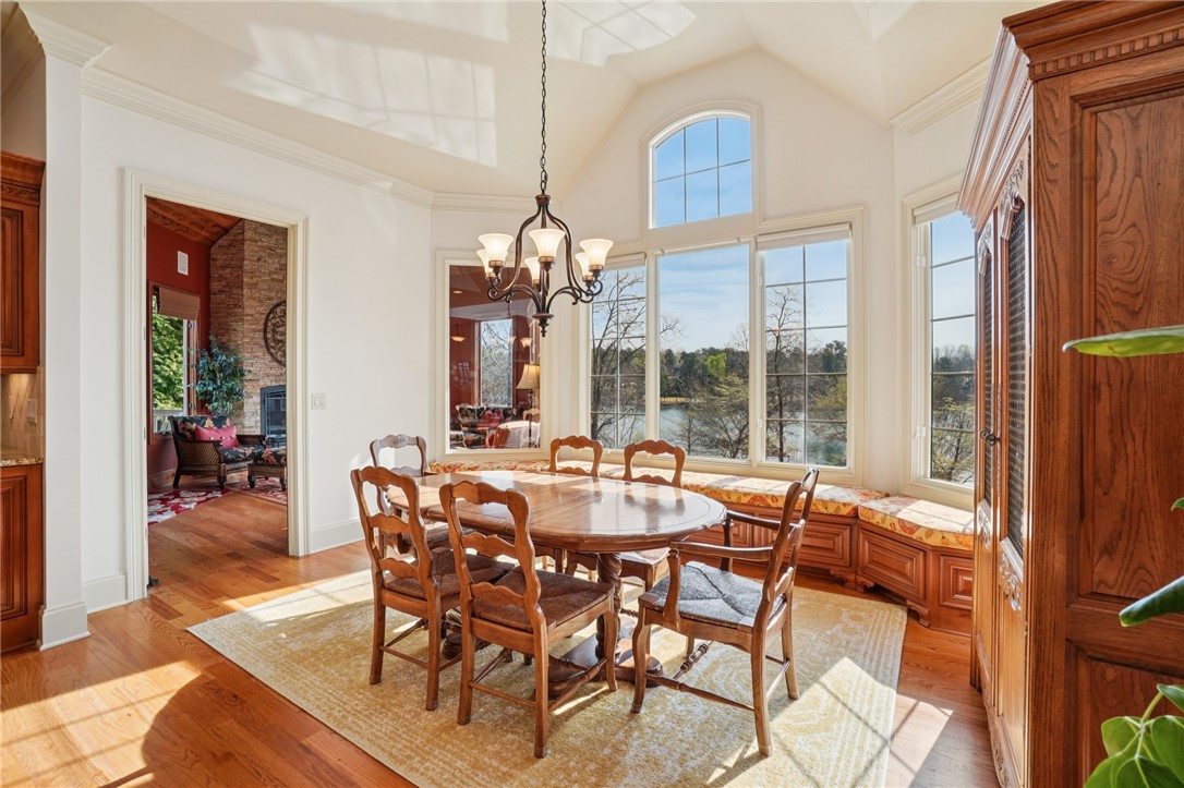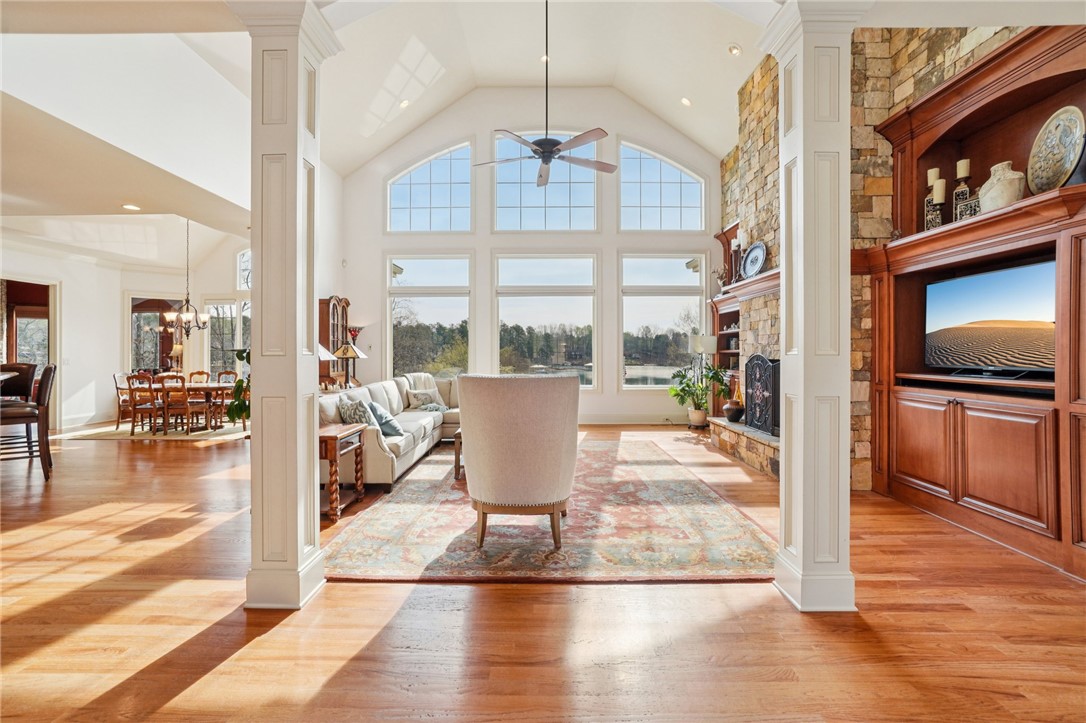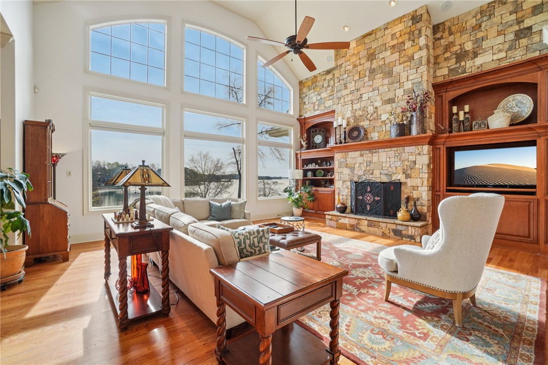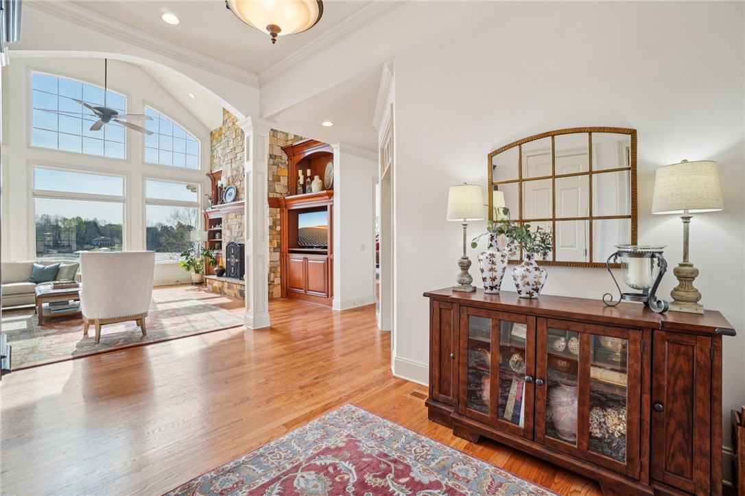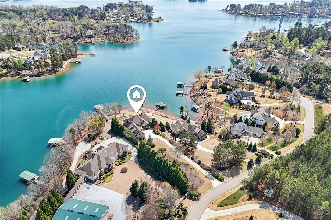 Stunning custom lakefront home in Moonlight Bay on Lake Keowee! Situated on a private 1.11-acre lot with approximately 135+/- feet of shoreline, this exceptional property offers the perfect blend of luxury, comfort, and breathtaking water views. Built in 2008 by Glenn English, this beautifully designed 3-story home features approximately 6,750 square feet with 5 bedrooms, 5 full baths, and 2 half baths. The thoughtfully designed floor plan includes a spacious main-level living area with soaring ceilings, abundant natural light, and seamless indoor-outdoor flow. The gourmet kitchen is equipped with granite countertops, stainless appliances, gas range, ice maker, and ample cabinetry—ideal for entertaining. Multiple fireplaces, a wet bar, elevator, and refined finishes throughout elevate the home’s appeal. The main-level primary suite offers comfort and privacy, while additional bedrooms on upper and lower levels provide ample space for family and guests. The terrace level features a recreation room, media space, and walkout access to the lake. Outdoor living is exceptional with covered and screened porches, patio spaces, and a hot tub/spa for relaxing evenings. Enjoy direct access to Lake Keowee from your private dock with lift, perfect for boating and water activities. Additional highlights include a 3-car attached garage, hardwood and tile flooring, multi-zone HVAC with heat pumps, central vacuum, and beautifully landscaped grounds. Located in a quiet, established lakefront community just minutes from Seneca, this home offers the ultimate lake lifestyle.