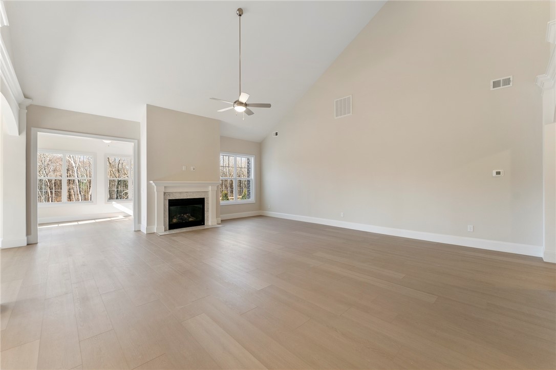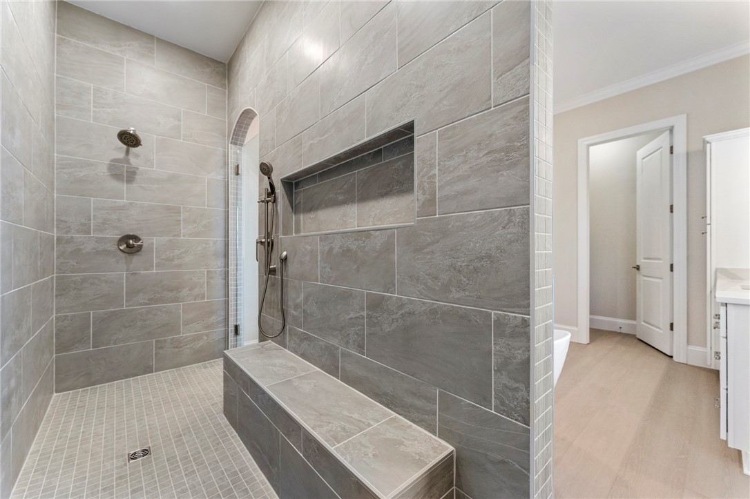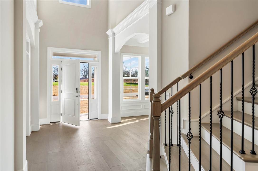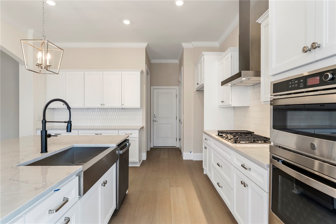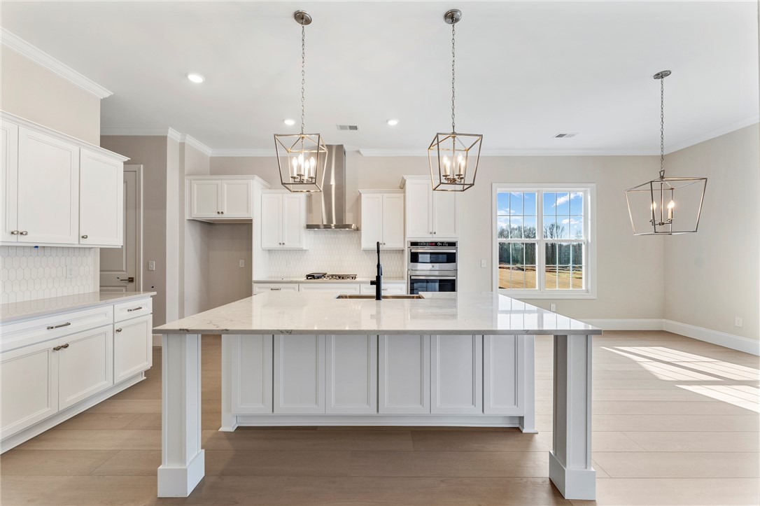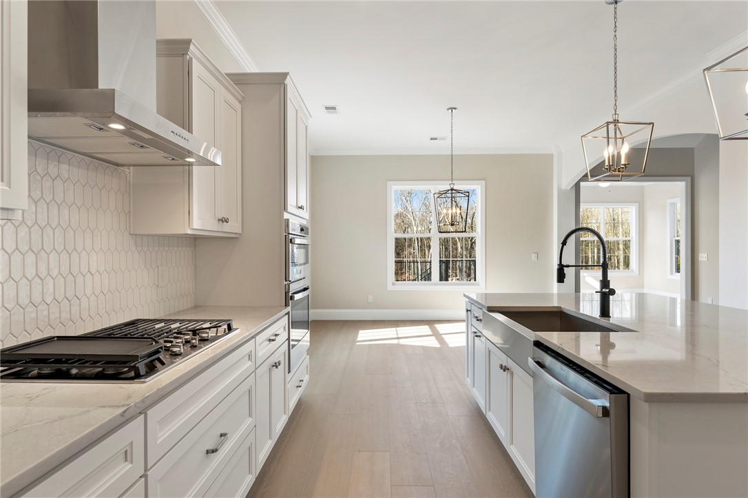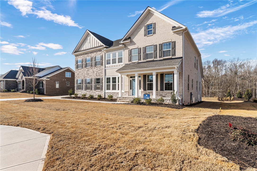 Welcome to 202 Chandler Court, a stunning showcase of refined craftsmanship and thoughtful luxury nestled in the heart of Easley’s Walnut Grove community. This stately home impresses from the start with its brick and stone-accented exterior, elegant board and batten siding, and side-entry garage. A full brick detached garage, black metal porch railings, and professionally designed landscaping with automatic irrigation add to the striking curb appeal. Inside, soaring 10-foot ceilings and wide-plank luxury vinyl floors lead you into an expansive open layout filled with natural light. The gourmet kitchen is a true centerpiece, featuring Charleston White cabinetry, quartz countertops, a stainless farmhouse sink, and a designer picket backsplash — seamlessly extending into a butler’s pantry and sunroom. The great room offers cozy elegance with a marble-surround fireplace, double crown molding, and smart wiring. The luxury primary suite features a frameless glass shower, garden tub, dual vanities, and quartz countertops. With five spacious bedrooms, including a private guest suite, four-and-a-half bathrooms, a bonus room, and flexible living spaces, this home is designed to grow with you