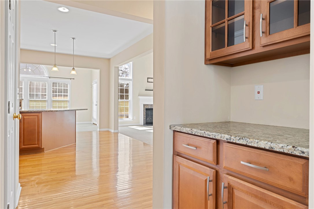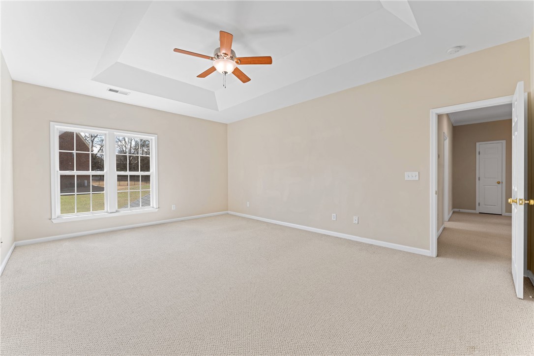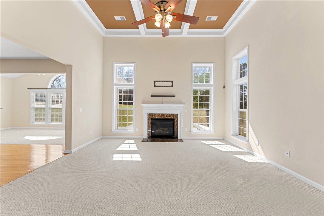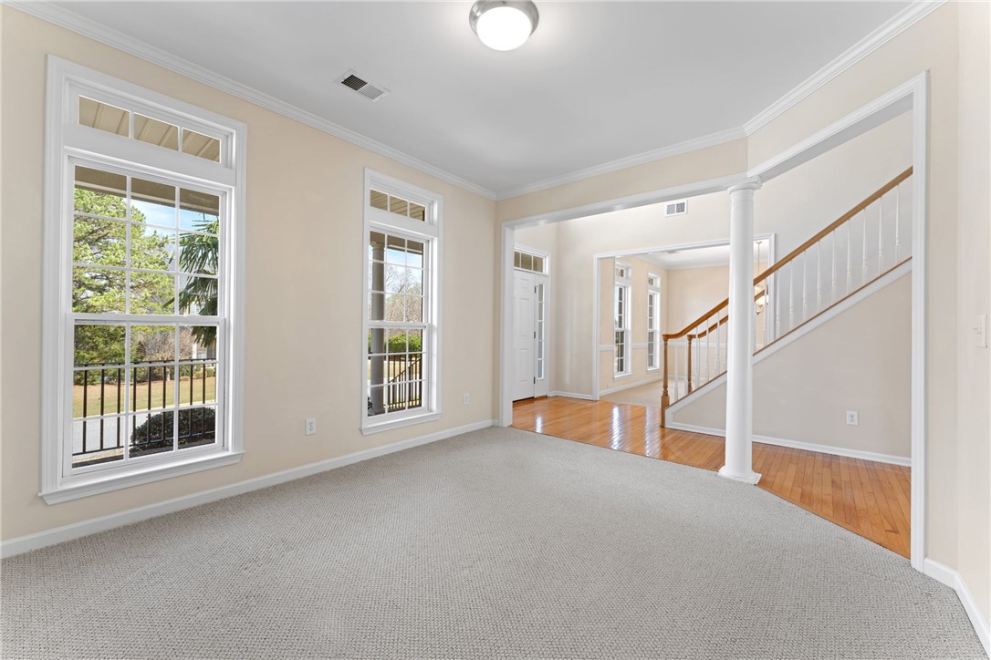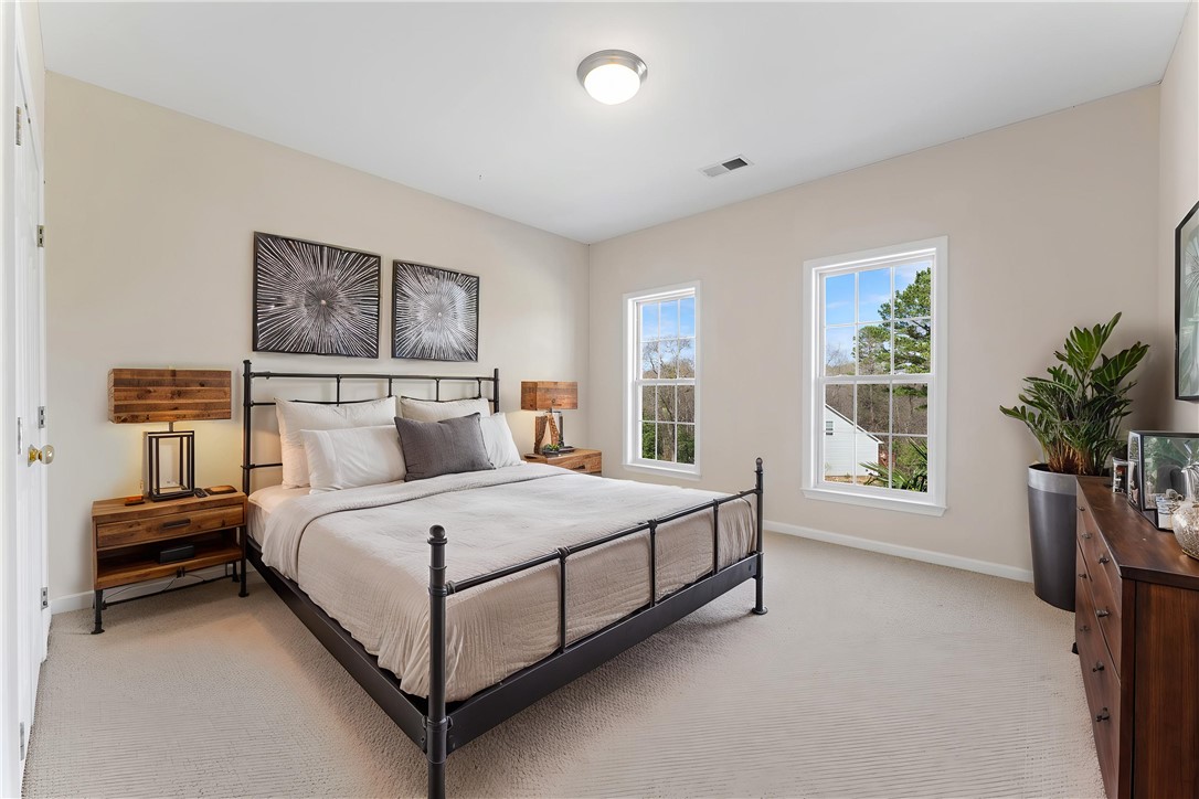 Welcome home to 30 Hydrangea Way, a beautiful home on a large corner lot located in a quiet cul de sac. This brick front home welcomes you with an extra large front porch that leads you into an open two story foyer filled with natural light. The beautiful hardwood floors are gleaming and look brand new. To the left you will find a spacious dining room with crown molding. To the right is a living room, and just beyond that is a private office with glass french doors. There is also a large half bath on the main level. Moving further into the home you enter the great room with coffered ceilings, an abundance of floor to ceiling windows, and a gas fireplace. This space opens into a large kitchen featuring stainless steel appliances, maple cabinets, a beautiful backsplash, a huge island, abundance of cabinetry, and a walk in pantry. The refrigerator will convey with the home. Just beyond the kitchen is a large sunroom that leads out to the back deck with Trex decking, offering low maintenance and peace of mind. Upstairs you will find the living quarters with three extra large bedrooms and a full bathroom with a dual vanity. The primary suite features tray ceilings, a very spacious layout, and a massive primary en suite. The bathroom includes a gorgeous soaking tub with a beautiful Palladium window above it, his and hers sinks on opposite sides of the room, a private water closet, and a large walk in closet. The upstairs level also includes a huge walk in laundry room and the washer and dryer will stay with the property. Outside the lot is .65 of an acre with endless possibilities and plenty of room for a pool. The home also offers a two car side entry garage. The neighborhood is beautiful with homes that are nicely spaced apart. There is also a lake view behind the home that is great for fishing. This property is located in the Five Forks area of Simpsonville super close to the GSP airport, hospitals, dining and shopping.