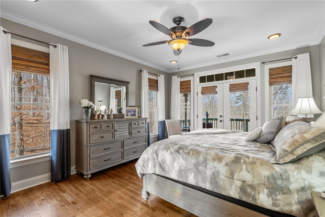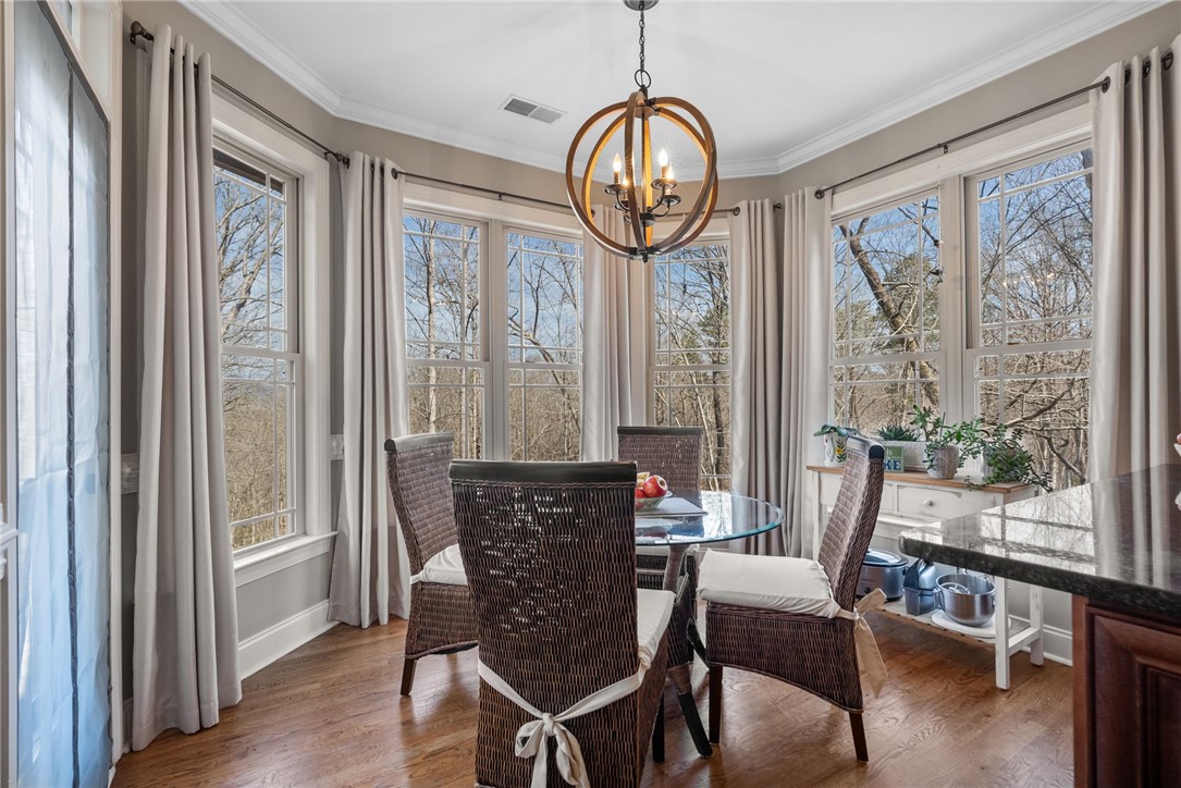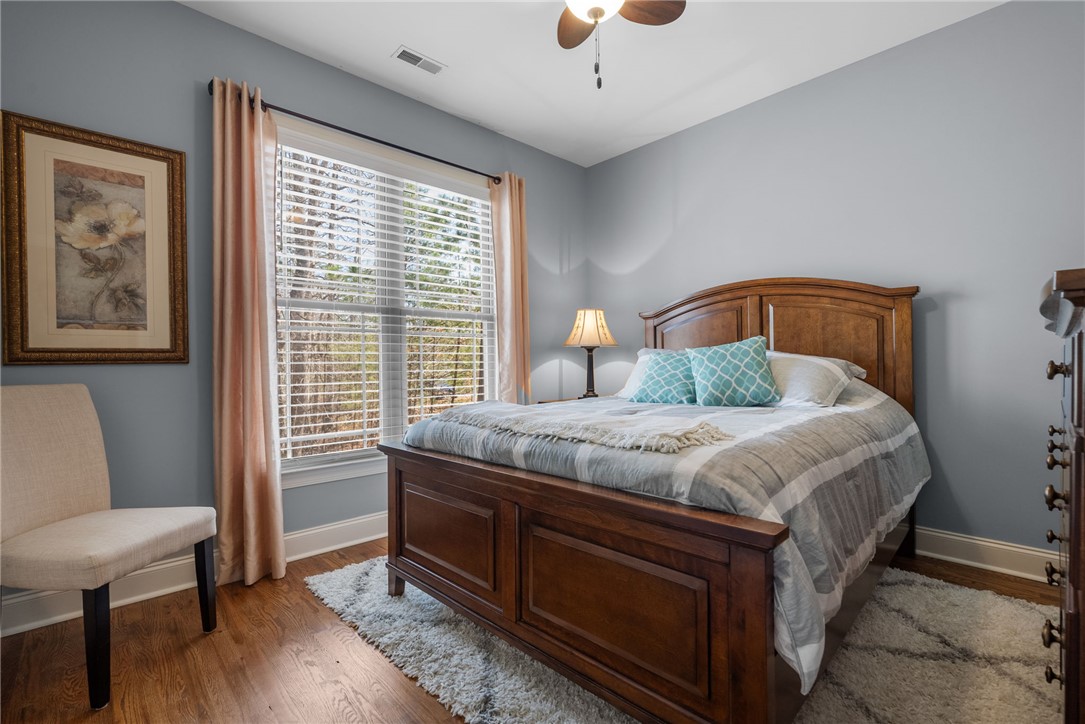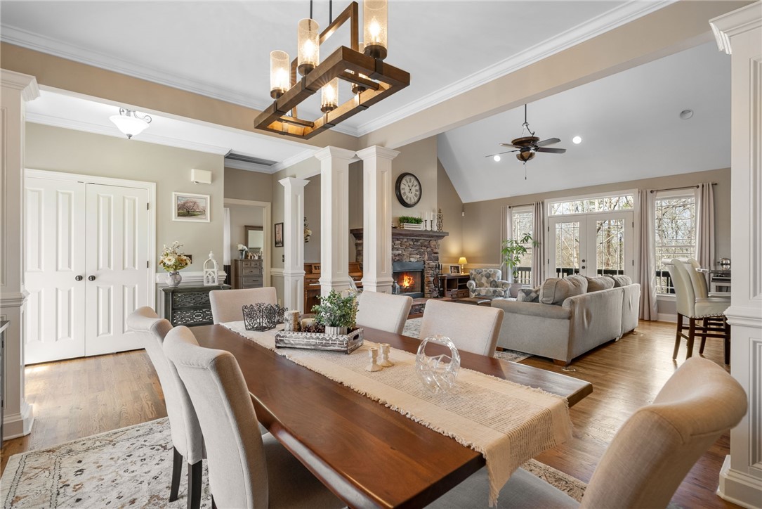 Craftsman-style 4BR/3BA home with hardwood floors and fresh paint throughout. The terrace level offers a full bath, bar, gas log fireplace, and private porch—ideal for an in-law suite or separate living quarters. A large bonus room over the garage offers a potential 5th bedroom. The gourmet kitchen features granite countertops, stainless appliances, and a 6-burner gas/electric range with griddle. All baths include ceramic tile and granite counters. Enjoy a formal dining room and breakfast area within an open-concept floor plan. Special features include a wood-burning fireplace on the main level, along with multiple terraces and decks with wooded mountain views. The large property provides privacy in a beautiful mountain setting. Enjoy evening fires in the newly built outdoor firepit. Meticulously maintained with extensive updates during ownership—truly a must-see. Located in a welcoming, active community less than 2 miles (under 5 minutes) from the Crow Creek boat launch. Neighborhood amenities include community storage, a scenic hiking trail with a waterfall, and a clubhouse with kitchen, dining and lounge areas, fireplace, and breathtaking mountain views. Lake access will be avail in the near future within the community for kayak and canoe launching.