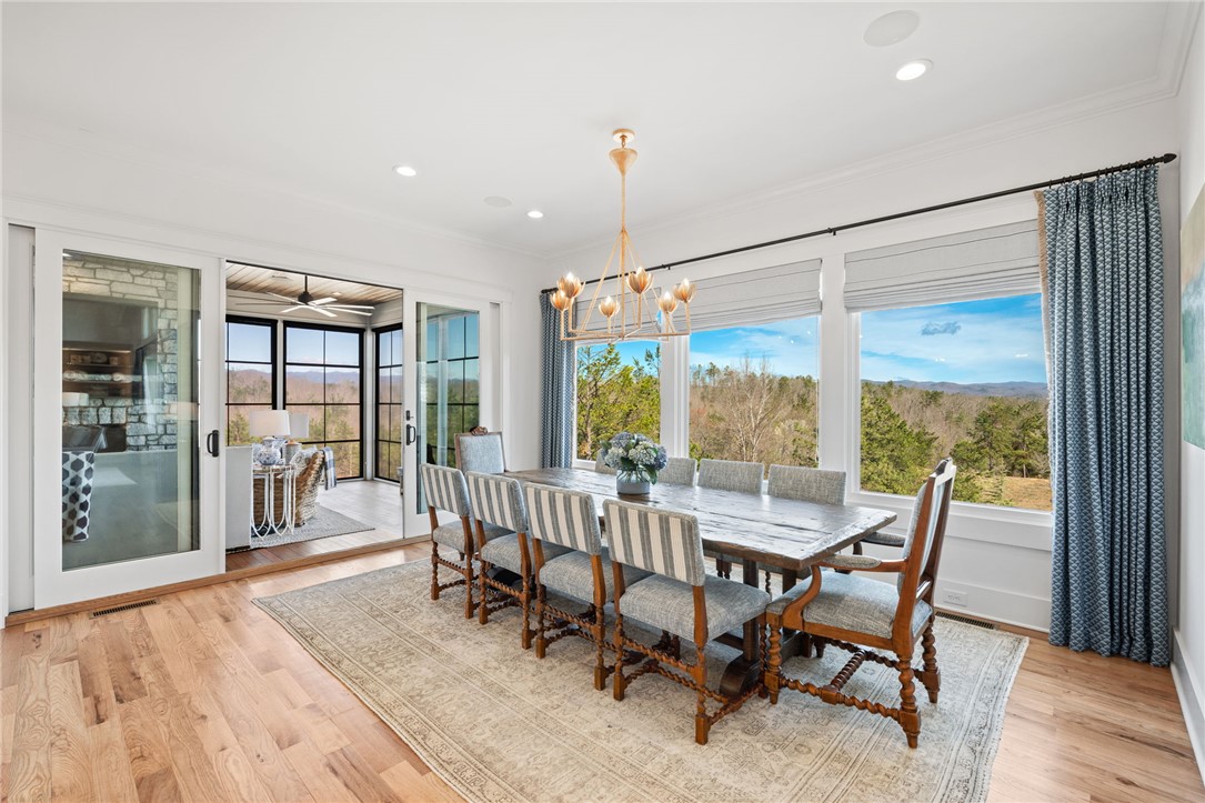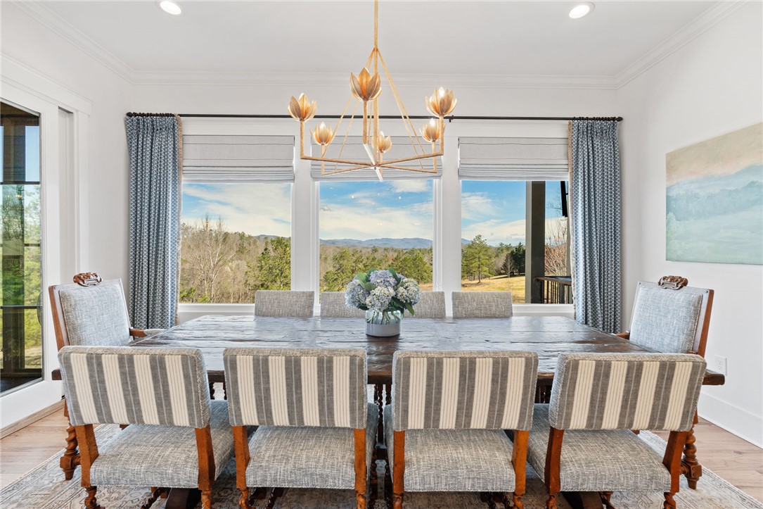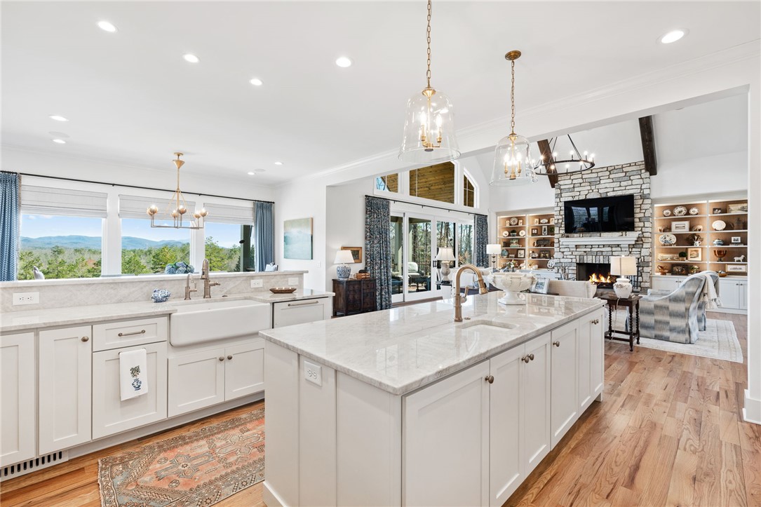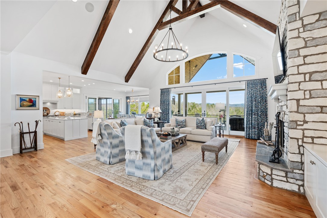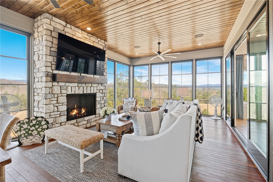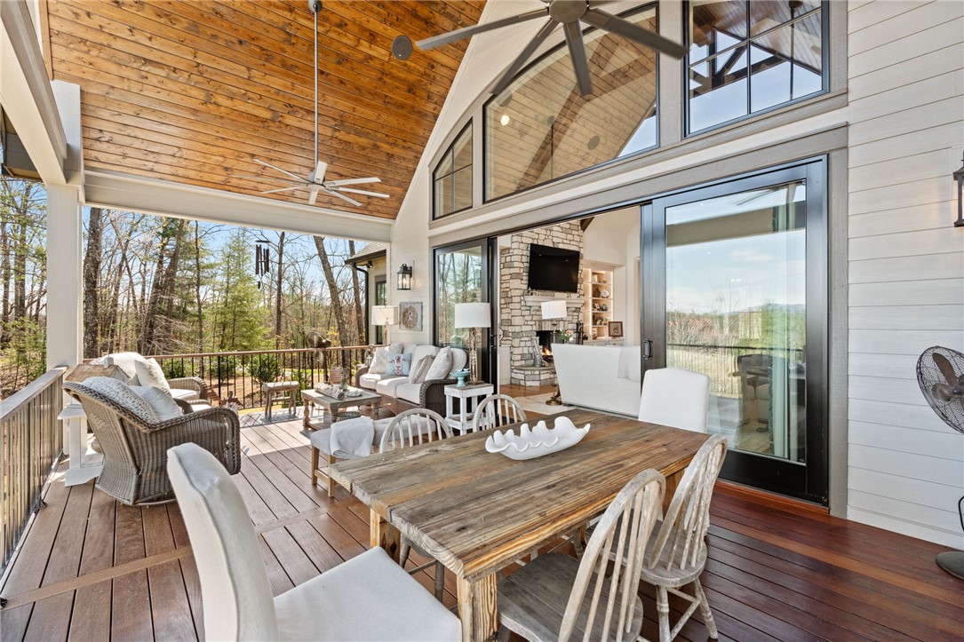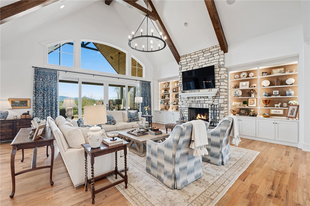 Exceptional Blue Ridge Mountain Retreat with Lake Keowee Boat Slip. 311 Sunset Ridge Way offers an impeccable and tastefully decorated estate home perched on an elevated plateau, providing expansive panoramic views of the Blue Ridge Mountains. This property features increasingly rare access to a boat slip on Lake Keowee. Nestled on nearly three acres, the home ensures privacy, open meadow vistas, and dramatic mountain ranges in multiple directions. The approach showcases a thoughtfully designed circular concrete driveway and motor court, complemented by paver parking pads. Upon entering, guests are welcomed into an open and functional floor plan filled with natural light and stunning mountain vistas. The home is designed for both relaxation and entertaining, with abundant outdoor living areas and carefully curated decor. The vaulted great room, enhanced with exposed beams, features a spacious sitting area oriented toward a striking floor-to-ceiling stone fireplace. Custom cabinetry and shelving flank the fireplace, providing display space for books and decorative pieces. The adjacent gourmet kitchen is a chef's dream, boasting a large center island, walk-in pantry, generous quartzite countertops, and high-end appliances from WOLF, SubZero, and Miele. The inviting dining area, lined with a wall of windows, offers exceptional views. Off the great room are two distinct family and entertainment spaces: an open covered porch ideal for relaxation, reading, or al fresco dining, and an all-season room with a stone fireplace extending to the ceiling. The all-season room includes EZ Breeze windows that adjust with the weather, sunshades for late afternoon sunsets, and a dedicated dining area. Additional main level features include a spacious laundry room, powder room, and an expansive three-car garage equipped with custom storage cabinetry. On the opposite side of the main level, the master suite provides mountain views and a spa-like bath with dual vanities, a large travertine shower, and separate his-and-her walk-in closets. Custom blinds, stylish wallpaper, custom mirrors, and additional decor enhance the suite’s comfort and appeal. The lower level offers three bedroom ensuites, a fourth bedroom, a cozy baby's room, and a large open recreation/media room complete with a bar—perfect for family gatherings or entertaining guests. There is a substantial unfinished storage area with shelving and space for mechanical systems. Outside, a wraparound patio provides the ideal setting for relaxation, featuring a game area with a ping pong table and comfortable seating. A short walk leads to a large, attractive firepit and ample open space, perfect for enjoying cool evenings and backyard activities. Above the three-car garage, a spacious bonus room offers flexible options for an additional bedroom, office, or exercise room. Currently, it serves as a children's entertainment area with a charming shiplap-wrapped bunk room accommodating four bunks and includes a half bath. Rare access to Lake Keowee is just a short half mile drive via car or golf cart to your leased boat slip with lift. This home is in pristine condition, boasting recent painting and staining, and is richly adorned with high-end finishes such as decorative wallpaper, custom mirrors, premium lighting, and many other designer touches. Furnishings are negotiable, though the seller will have some exclusions.
