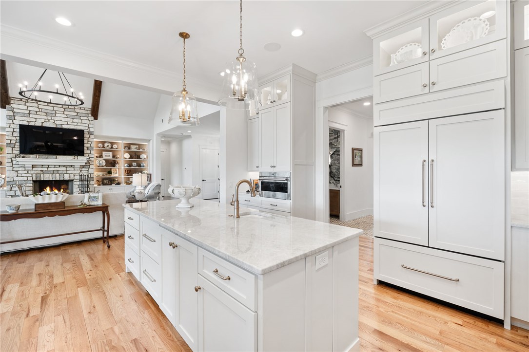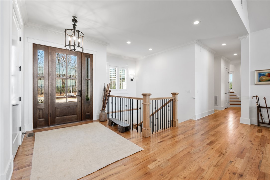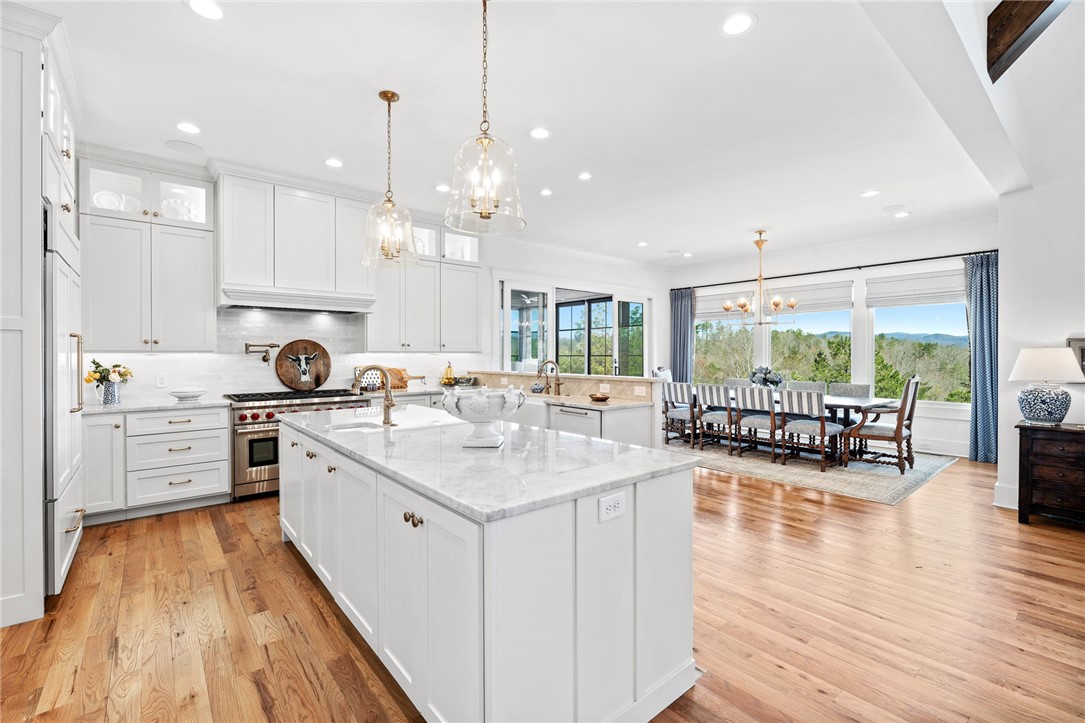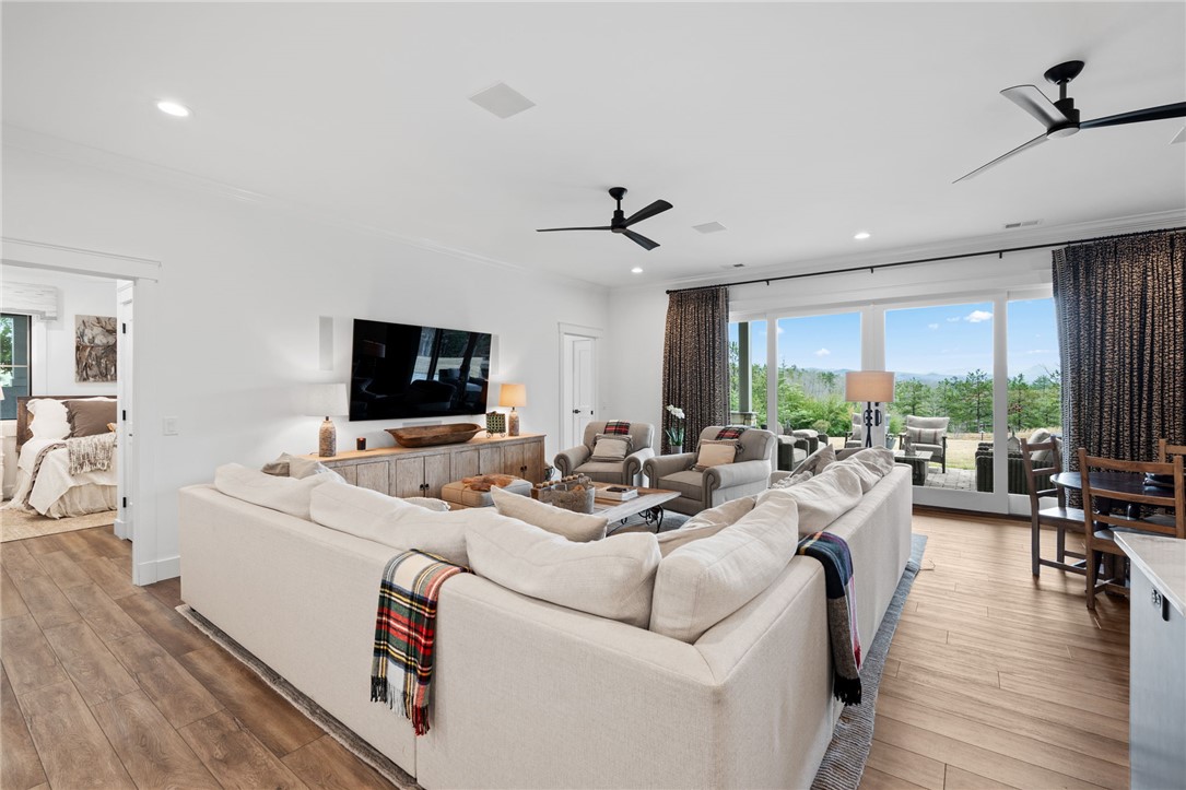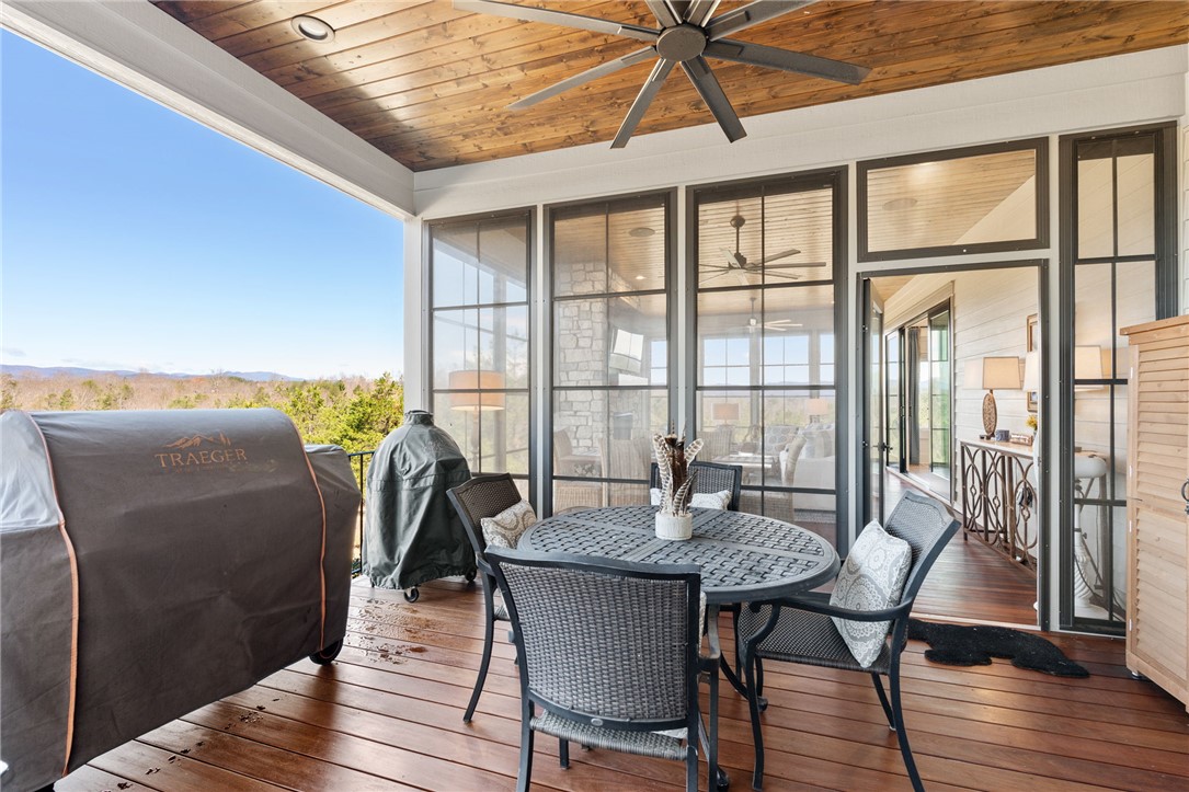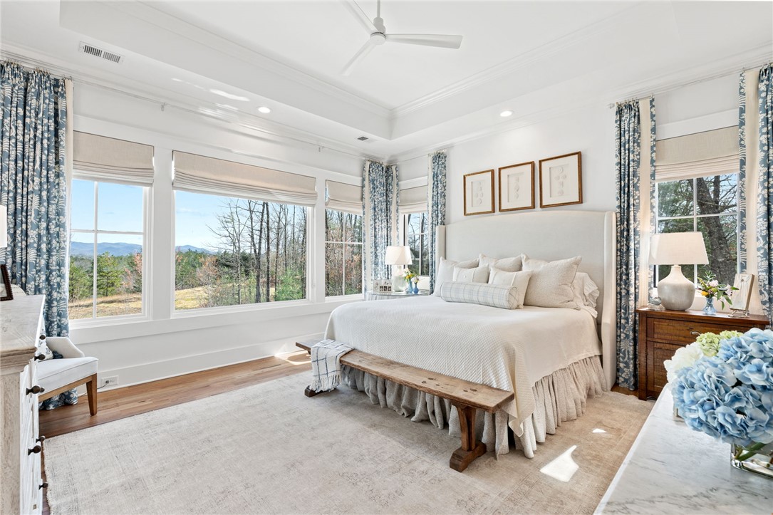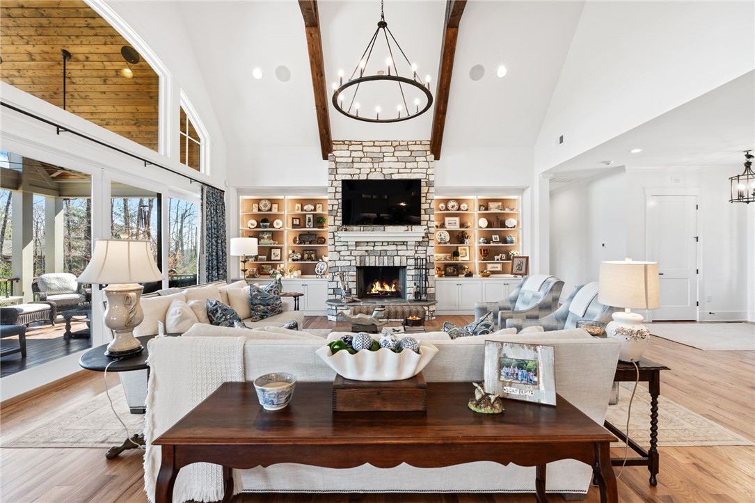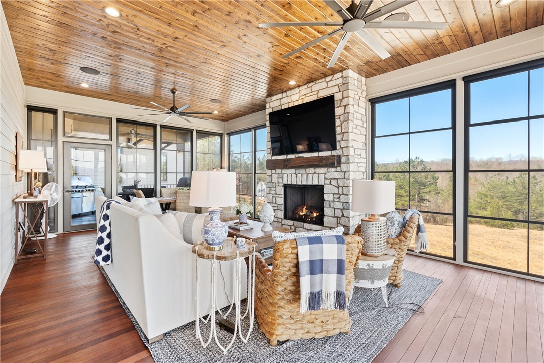 Exceptional Blue Ridge Mountain Retreat with Lake Keowee Boat Slip. 311 Sunset Ridge Way offers an impeccable and tastefully decorated estate home perched on an elevated plateau, providing expansive panoramic views of the Blue Ridge Mountains. This property features increasingly rare access to a boat slip on Lake Keowee. Nestled on nearly three acres, the home ensures privacy, open meadow vistas, and dramatic mountain ranges in multiple directions. The approach showcases a thoughtfully designed circular concrete driveway and motor court, complemented by paver parking pads. Upon entering, guests are welcomed into an open and functional floor plan filled with natural light and stunning mountain vistas. The home is designed for both relaxation and entertaining, with abundant outdoor living areas and carefully curated decor. The vaulted great room, enhanced with exposed beams, features a spacious sitting area oriented toward a striking floor-to-ceiling stone fireplace. Custom cabinetry and shelving flank the fireplace, providing display space for books and decorative pieces. The adjacent gourmet kitchen is a chef's dream, boasting a large center island, walk-in pantry, generous quartzite countertops, and high-end appliances from WOLF, SubZero, and Miele. The inviting dining area, lined with a wall of windows, offers exceptional views. Off the great room are two distinct family and entertainment spaces: an open covered porch ideal for relaxation, reading, or al fresco dining, and an all-season room with a stone fireplace extending to the ceiling. The all-season room includes EZ Breeze windows that adjust with the weather, sunshades for late afternoon sunsets, and a dedicated dining area. Additional main level features include a spacious laundry room, powder room, and an expansive three-car garage equipped with custom storage cabinetry. On the opposite side of the main level, the master suite provides mountain views and a spa-like bath with dual vanities, a large travertine shower, and separate his-and-her walk-in closets. Custom blinds, stylish wallpaper, custom mirrors, and additional decor enhance the suite’s comfort and appeal. The lower level offers three bedroom ensuites, a fourth bedroom, a cozy baby's room, and a large open recreation/media room complete with a bar—perfect for family gatherings or entertaining guests. There is a substantial unfinished storage area with shelving and space for mechanical systems. Outside, a wraparound patio provides the ideal setting for relaxation, featuring a game area with a ping pong table and comfortable seating. A short walk leads to a large, attractive firepit and ample open space, perfect for enjoying cool evenings and backyard activities. Above the three-car garage, a spacious bonus room offers flexible options for an additional bedroom, office, or exercise room. Currently, it serves as a children's entertainment area with a charming shiplap-wrapped bunk room accommodating four bunks and includes a half bath. Rare access to Lake Keowee is just a short half mile drive via car or golf cart to your leased boat slip with lift. This home is in pristine condition, boasting recent painting and staining, and is richly adorned with high-end finishes such as decorative wallpaper, custom mirrors, premium lighting, and many other designer touches. Furnishings are negotiable, though the seller will have some exclusions.