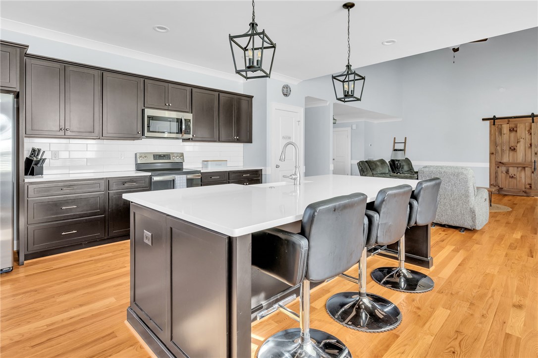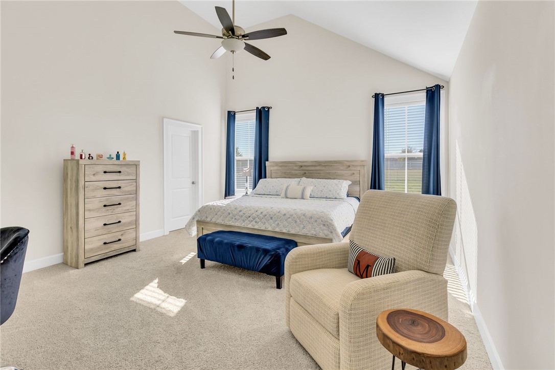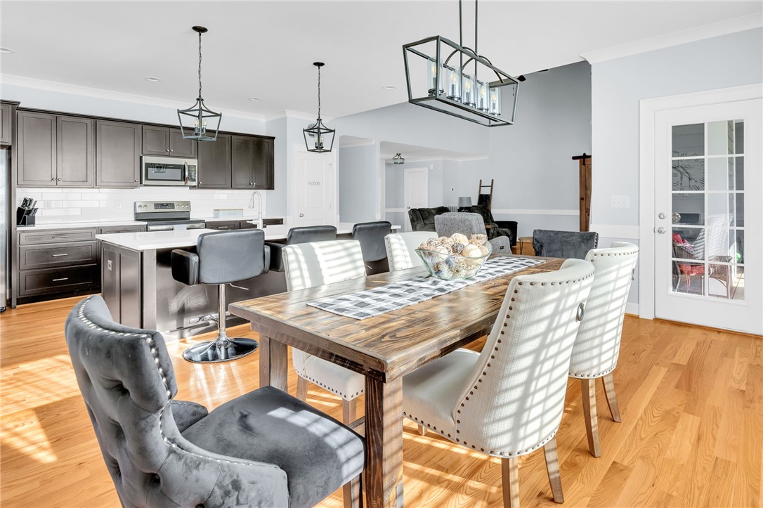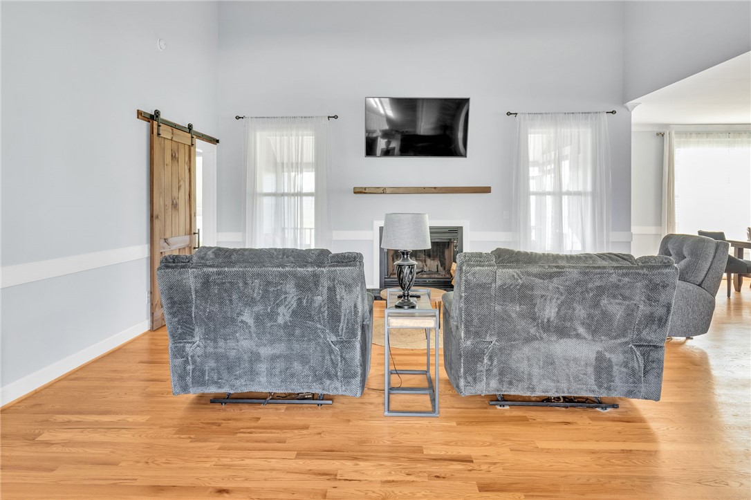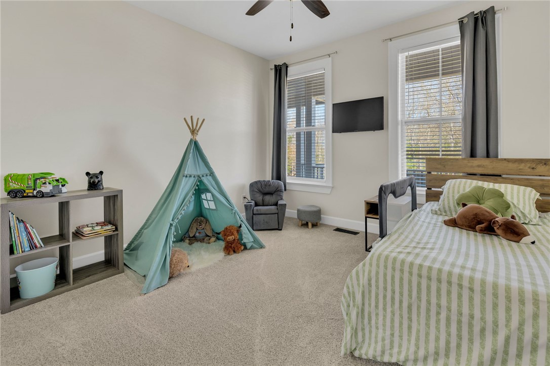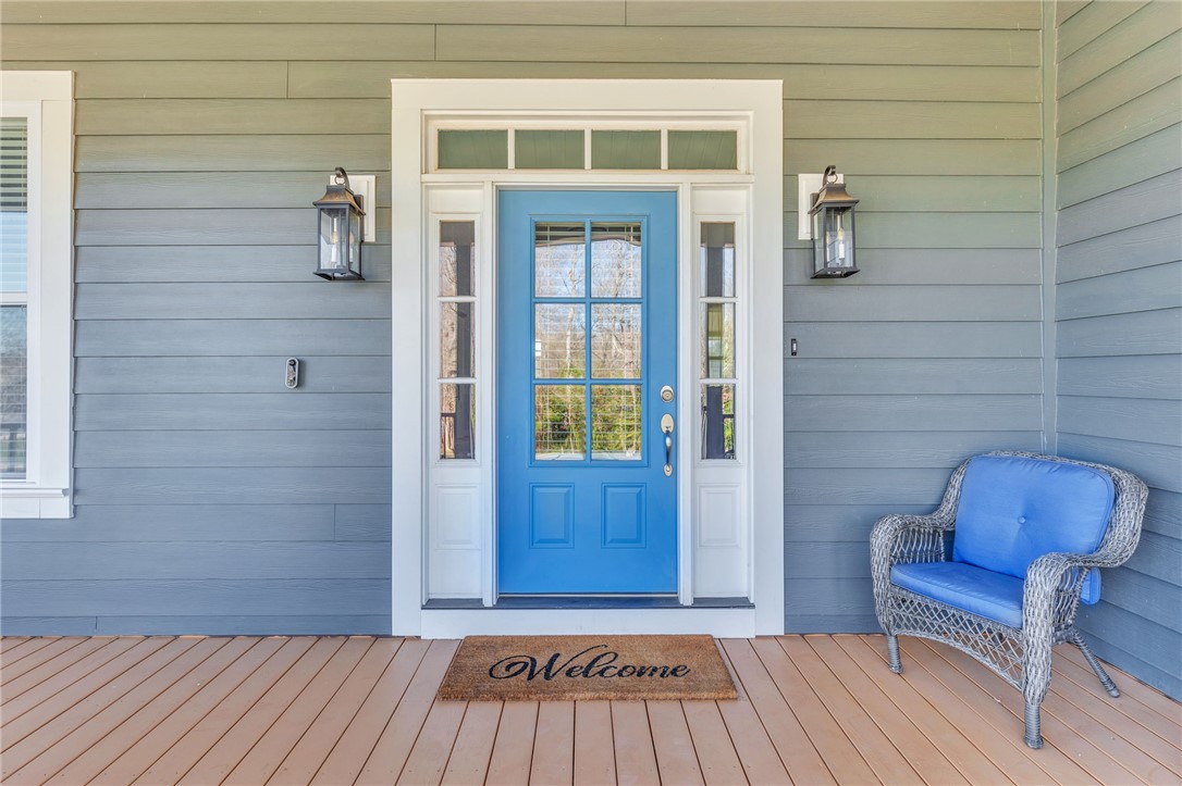 Welcome to 112 Lipizzaner Court in Pelzer, a custom-built home located in the desirable Saddlehorn community, where peaceful rural living meets an equestrian lifestyle. Situated on a 0.73-acre lot, this property offers over 2,800 sq ft, 4 bedrooms, and 3 bathrooms. The exterior features striking Iron Gray Masonite siding and an impressive 40-foot rocking chair front porch overlooking peaceful wooded views. Inside, a welcoming foyer opens to a bright open-concept living area with cathedral ceilings, hardwood floors, oversized windows, and a sleek black fireplace with custom wood mantel. Stylish sliding barn doors enhance the home’s modern farmhouse design. The kitchen is beautifully appointed with black shaker cabinets, white quartz countertops, and a spacious island with ceramic farmhouse sink, brushed nickel fixtures, and bar seating. A breakfast area sits just off the kitchen, while the dining room provides access to a large screened porch with vaulted ceilings, perfect for relaxing and enjoying sunset views. The primary suite features vaulted ceilings and a spa-inspired bath with dual vanities, a tiled walk-in shower with seating, rainfall and wall shower heads, and a large walk-in closet. Two additional bedrooms share a full bath on the main level. Upstairs offers a fourth bedroom, recreation room, and full bath, providing flexible space for guests or a home office. The backyard includes side privacy fencing and rear white iron fencing with views of neighboring horse pastures, plus a patio ideal for entertaining. There is ample room for a pool, and a pool company has already evaluated potential placement (details available). Additional features include a 2-car garage, storage shed, and low HOA dues of $675/year. Residents of Saddlehorn enjoy 75+ acres of horse pastures, a stocked fishing pond, and scenic walking trails, creating a tranquil yet active lifestyle. Saddlehorn offers community pastures and stables for horses, and recreational pond and trails along the creek and pastures.