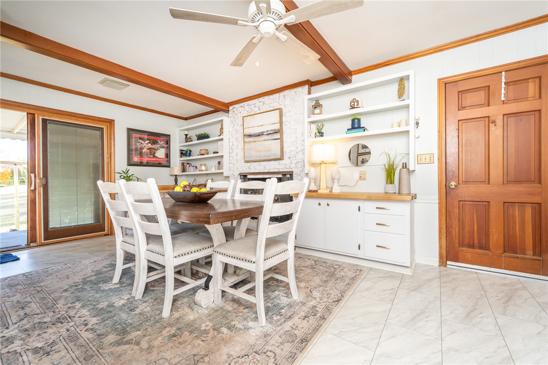 Enjoy beautiful mountain views from this charming brick ranch located on Glassy Mountain in Pickens, offering the freedom of no HOA or restrictive covenants. The interior features original hardwood floors throughout a functional layout that includes three bedrooms, two bathrooms, and a welcoming living room centered around a cozy gas log fireplace. The home provides ample storage and utility space with an eat-in kitchen, a dining room featuring classic built-ins, and a spacious laundry room with space for a pantry. Outdoor living is a breeze with both a large front porch and a covered back porch, perfect for taking in the scenery. Additionally, the property includes a large outbuilding for extra storage or workshop needs as well as a walk-in crawl space.