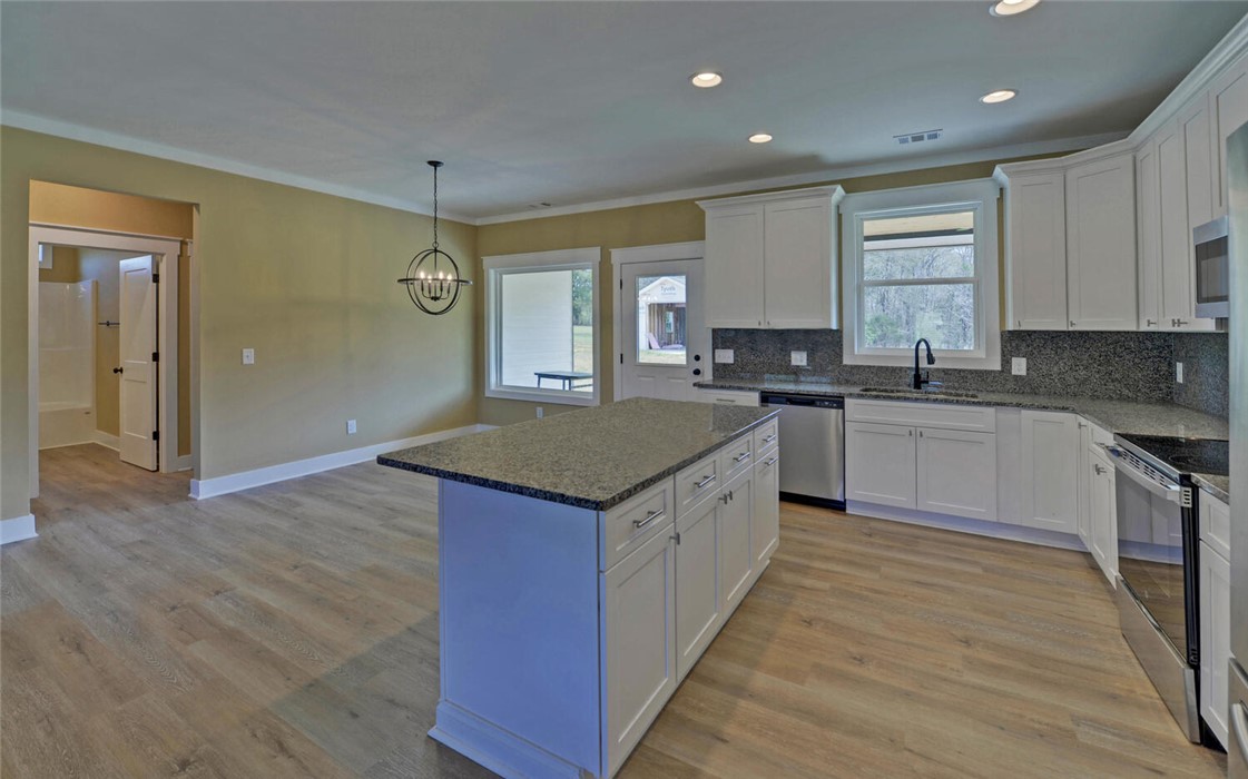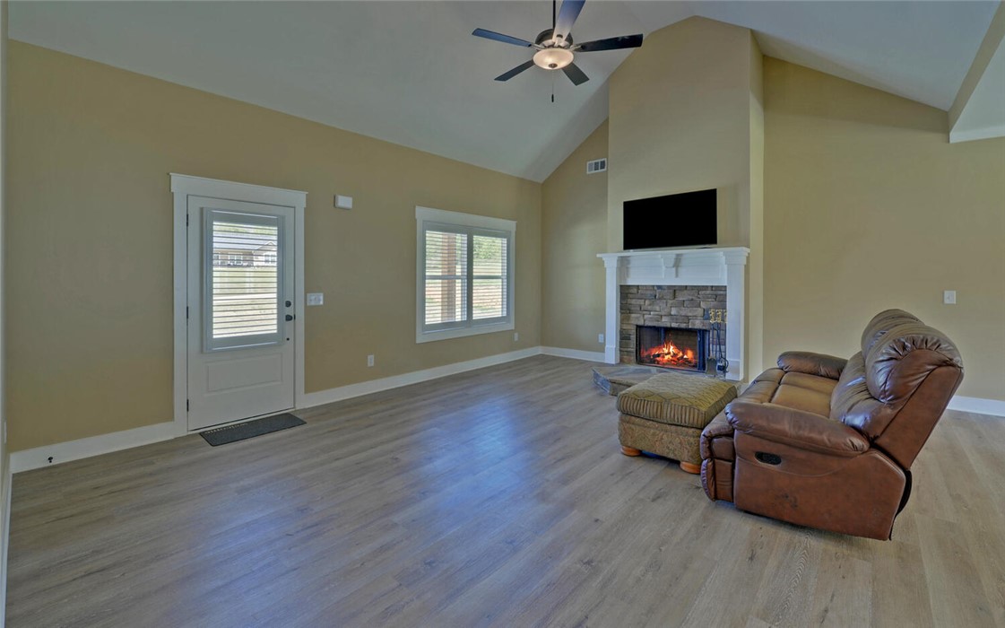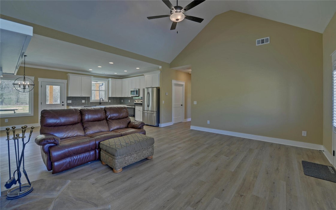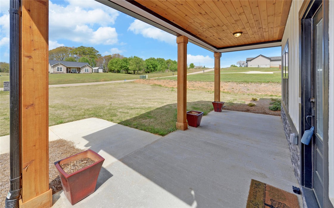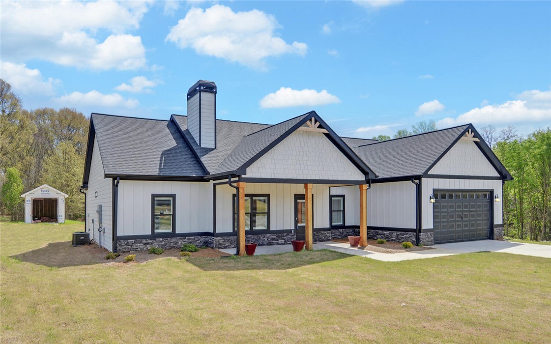 Welcome to your Craftsman-style dream home, where comfort, style, and peaceful living come together beautifully. Restricted subdivision, just minutes to town. Enjoy relaxing mornings on the inviting front porch or unwind on the covered back patio, both featuring stunning wood ceilings. Inside, the spacious great room welcomes you with a cozy stone fireplace, perfect for gathering with family and friends. The kitchen is a true standout, offering granite countertops and backsplash, stainless steel appliances, and soft-close cabinetry & ideal for both everyday living and entertaining. Luxury vinyl plank flooring flows throughout the home, combining style with durability. This thoughtfully designed home includes a separate laundry room with a new washer and dryer. The owner’s suite is a private retreat, featuring a spa-like ensuite bath with modern finishes, a huge handicap-accessible tile walk-in shower, separate soaking tub, and an oversized walk-in closet. With 3 bedrooms, 2 bathrooms, and 1,855 square feet and attached garage, there’s plenty of space for everyone. Situated on 2.44 acres, the oversized lot includes a portion of a peaceful pond, creating your own oasis. Additional highlights include a brand-new outbuilding (in the process of being finished with an overhead and walk-in door). This custom-built home has numerous upgrades by the owner, including spray foam insulation installed in the attic, a sprinkler system, and a beautifully sodded yard. This exceptional property truly has it all - don’t miss your chance to call it home!