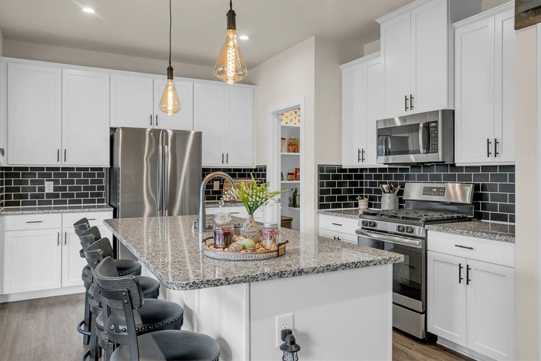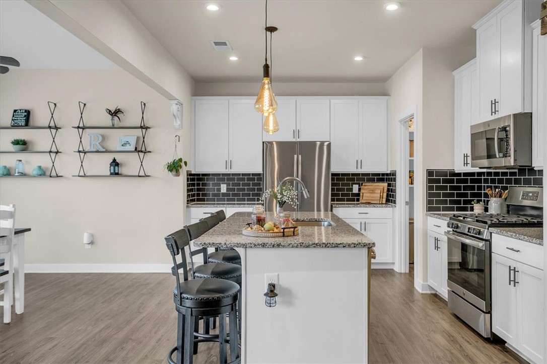 From the moment you step inside, you will notice how bright and pristine 307 Vicksburg Drive feels, with abundant natural light and a fresh, well-kept interior that creates an inviting first impression. Built in 2018 and beautifully maintained, this property offers comfortable, well-designed living spaces, quality finishes, and a location that makes daily life easy—just 15–20 minutes from downtown Greenville. Step inside to an open-concept layout designed for both everyday living and entertainment. The stunning white kitchen features granite countertops, a large island, stainless steel appliances with a gas cooktop, eye-catching backsplash, and an oversized pantry complete with a coffee bar. The kitchen flows seamlessly into the spacious living room, highlighted by a beautiful accent wall that adds warmth and character, along with a bright morning room/dining area. A versatile flex room on the main level provides the ideal space for a home office, playroom, or additional living area. Upstairs, you will find three additional bedrooms and a generous loft, offering plenty of room to spread out. The huge primary suite is a relaxing retreat with a trey ceiling, custom walk-in closet system, dual vanities, and a large walk-in shower. Outdoor living is just as inviting, with a covered back porch overlooking a fully fenced backyard featuring privacy fencing, a custom shed with built-in shelving, and solar lighting along the fence—creating a cozy ambiance for relaxing evenings or entertaining guests. This home has been meticulously cared for and includes custom blinds, designer ceiling fans in all bedrooms, pendant lighting in the kitchen, ceiling speakers in the living room, an epoxy-coated garage floor, smart garage door opener, in-ground sprinkler system, wired alarm system, and a French drain along the side of the home. The garage was extended an additional two feet during construction for added space and functionality. Located in the quiet, established community of The Oaks at Shiloh Creek, near shopping, dining, and schools, this move-in ready home stands out for its easy access to I-85—making commuting and travel a breeze.