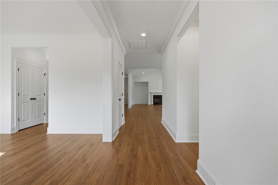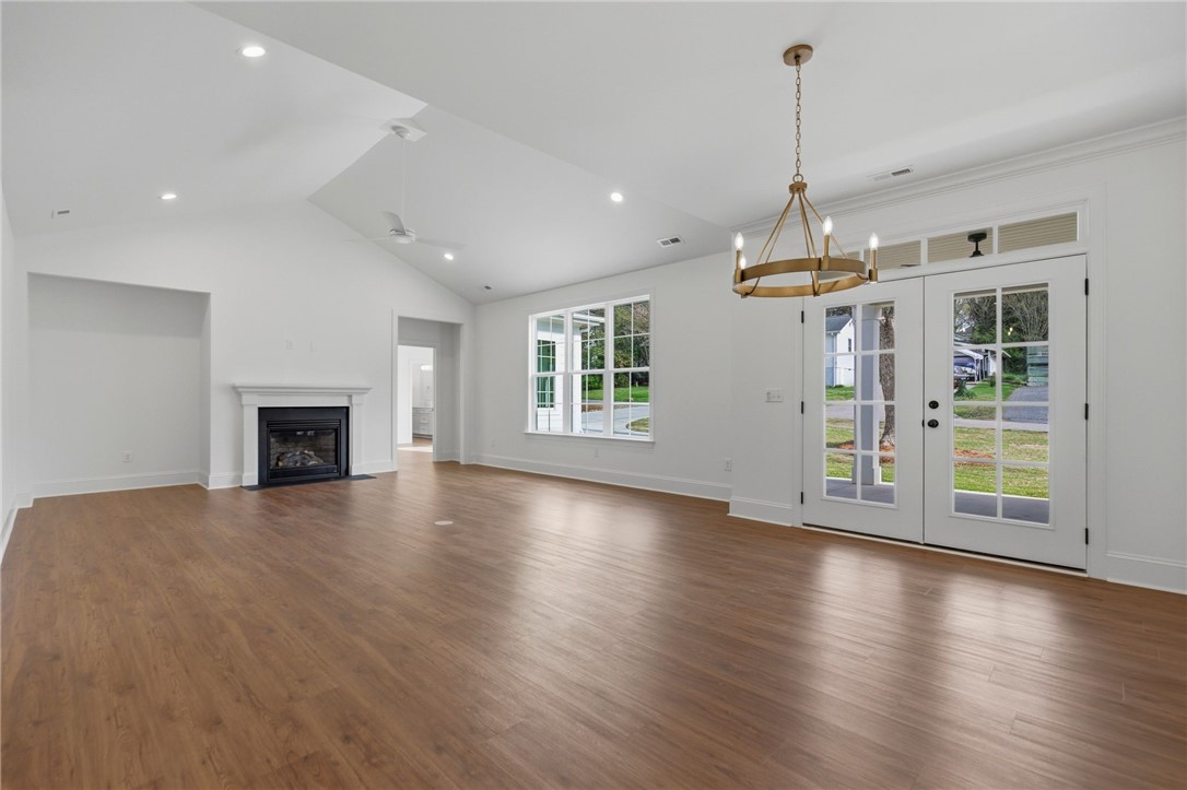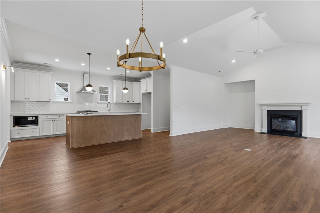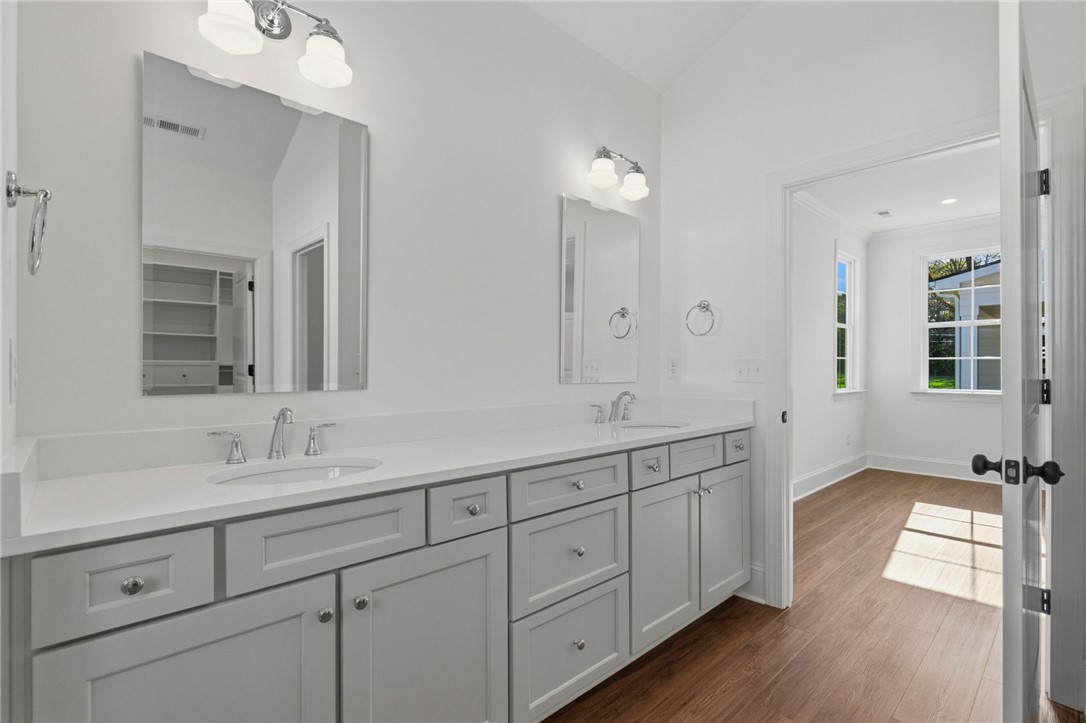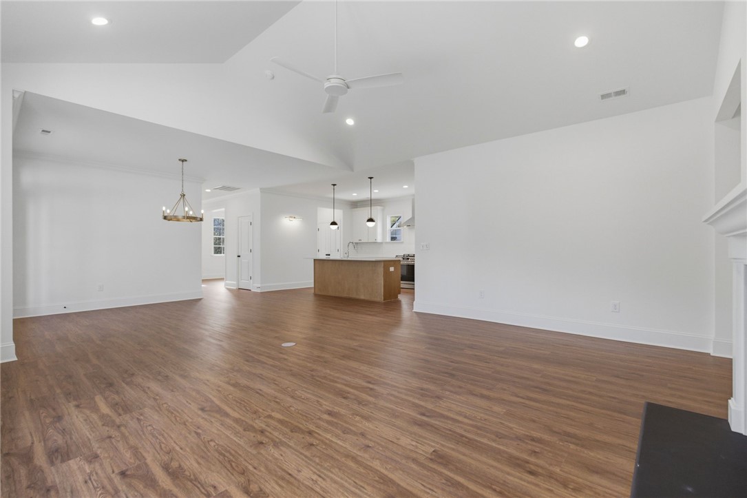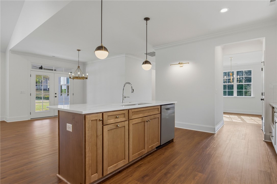 Beautifully crafted one-level custom home in the heart of downtown Easley! Designed with attention to every detail, this stunning home features luxury vinyl flooring throughout, gorgeous quartz countertops, and stylish fixtures that elevate every space. The open floor plan is ideal for entertaining, complemented by vaulted ceilings in the great room and a flexible space perfect for a formal dining room or home office. The split-bedroom design offers privacy, with a spacious primary suite featuring a custom walk-in closet, double vanity, a relaxing soaking tub, and a separate tiled shower. The kitchen is equipped with stainless steel appliances and flows seamlessly into the main living areas. Additional highlights include a tankless water heater and a two-car garage with a convenient utility sink. Step outside to the covered porch—your own private oasis—overlooking a beautifully manicured yard with a full sprinkler system. Located just a short walk to downtown Easley, the Doodle Trail, Silos shopping, restaurants, and medical facilities, this home truly has it all!
