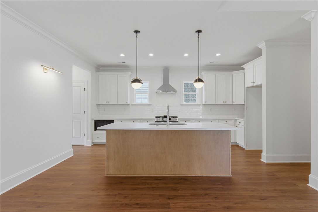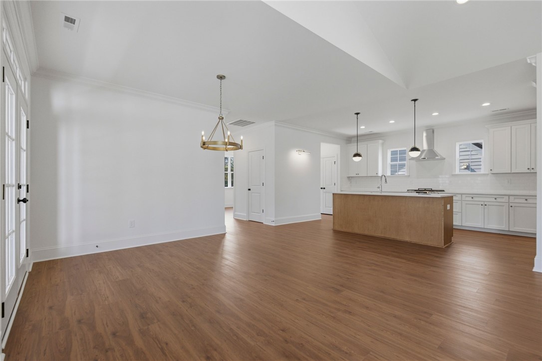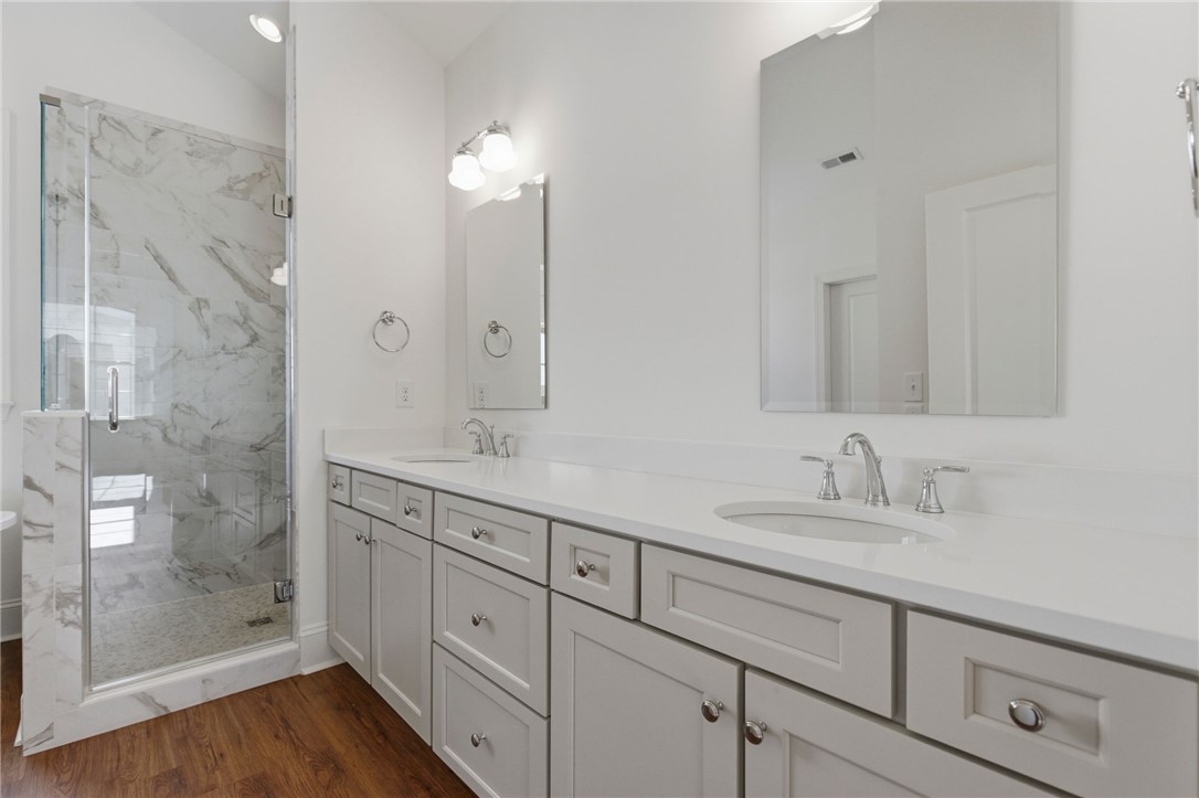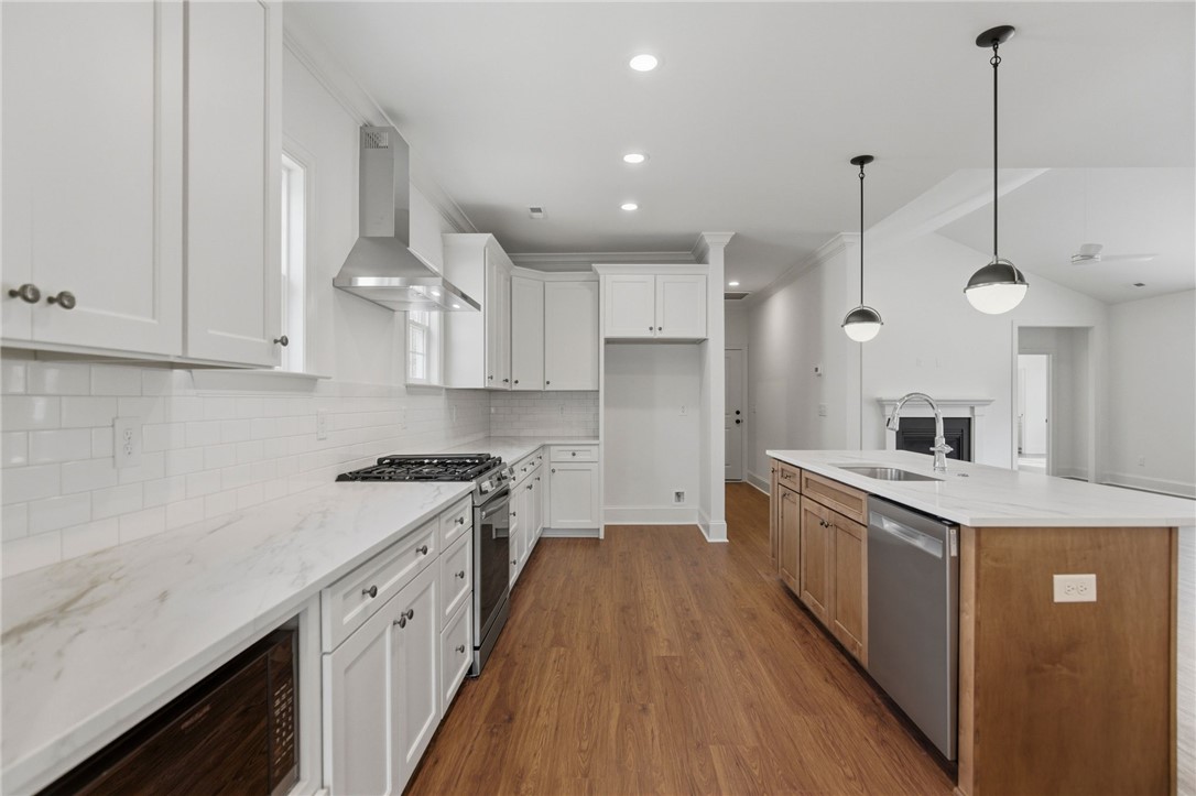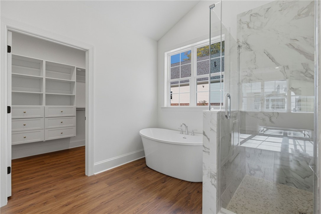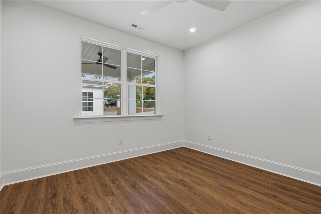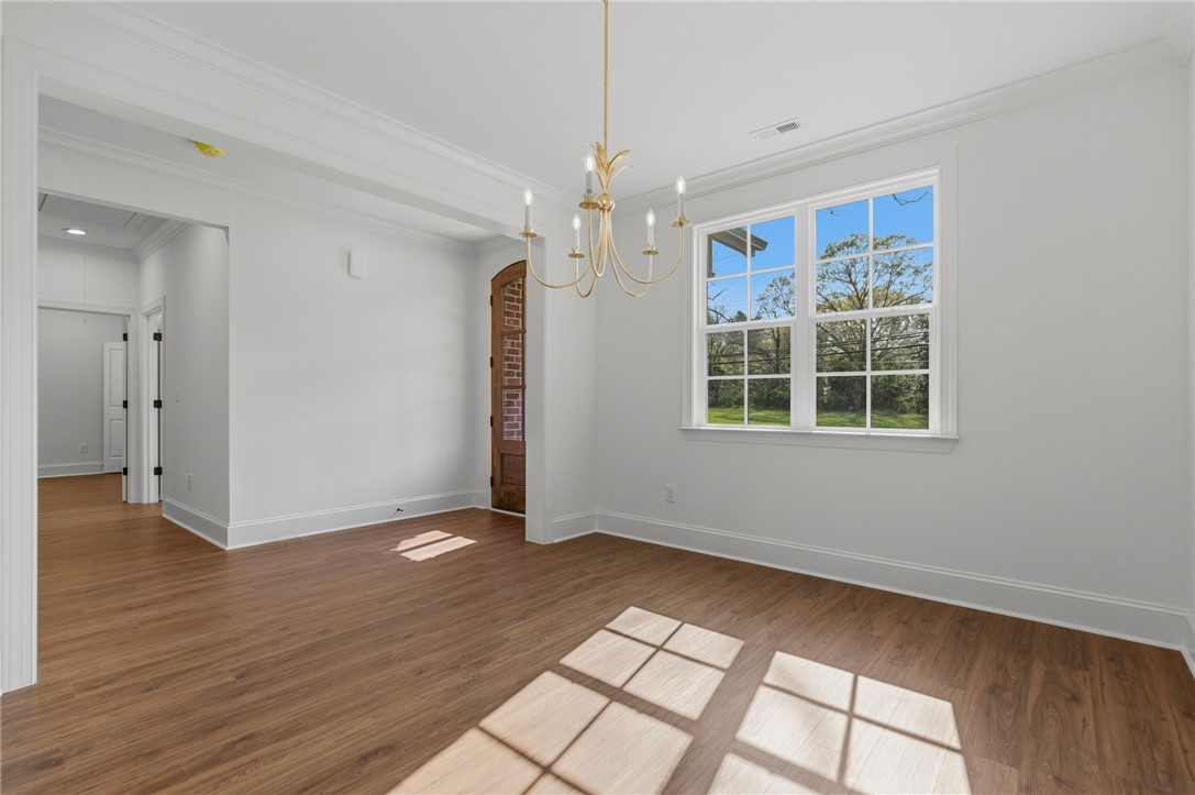 Beautifully crafted one-level custom home in the heart of downtown Easley! Designed with attention to every detail, this stunning home features luxury vinyl flooring throughout, gorgeous quartz countertops, and stylish fixtures that elevate every space. The open floor plan is ideal for entertaining, complemented by vaulted ceilings in the great room and a flexible space perfect for a formal dining room or home office. The split-bedroom design offers privacy, with a spacious primary suite featuring a custom walk-in closet, double vanity, a relaxing soaking tub, and a separate tiled shower. The kitchen is equipped with stainless steel appliances and flows seamlessly into the main living areas. Additional highlights include a tankless water heater and a two-car garage with a convenient utility sink. Step outside to the covered porch—your own private oasis—overlooking a beautifully manicured yard with a full sprinkler system. Located just a short walk to downtown Easley, the Doodle Trail, Silos shopping, restaurants, and medical facilities, this home truly has it all!