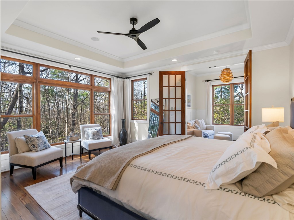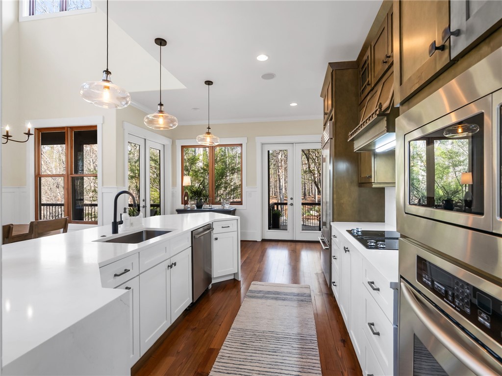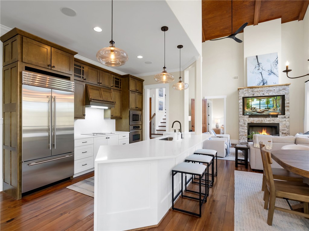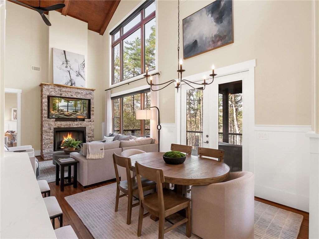 107 Fire Pink Court offers a rare combination of privacy, waterfront living, generous space for gathering, and close proximity to community amenities. Tucked into a serene, wooded setting within The Cliffs at Keowee Vineyards, this home is designed with versatility in mind – perfect for hosting guests or accommodating multiple families. The layout features expansive primary suites on both the main and lower levels, each complete with its own private sitting area behind French doors. With full kitchens on both levels, the home easily functions as two separate living spaces when needed. The upper level includes two additional bedrooms plus a large bonus room, while the lower level offers two additional bedrooms, a full service kitchen, and media room. The home also boasts completely remodeled entertainment areas, thoughtfully updated to enhance both comfort and functionality – creating inviting spaces ideal for gathering with family and friends. Outdoor living is a highlight, with two spacious porches overlooking the natural surroundings and a paver patio that creates an ideal setting for relaxing evenings. The dock, as well as the direct lake access from the property, combine to create an easy transition to your boat, watersports, and summer days on Lake Keowee. Inside, the home showcases warm, inviting finishes such as pine flooring on the main level, oak staircases, detailed wainscoting, and soaring wood ceilings. Large windows bring in abundant natural light and capture peaceful lake views throughout. Being sold fully stocked and furnished, this home offers a true turnkey opportunity. Located in the gated community of The Cliffs at Keowee Vineyards, you will enjoy convenient access to exceptional amenities, including a beautiful clubhouse (4 min drive), a Tom Fazio-designed golf course (4 min drive), a newly updated wellness center, pool, full-service marina (6 minute drive), and equestrian facilities. This property presents an outstanding opportunity to enjoy lakefront living in one of Lake Keowee’s most desirable communities – at a price point that’s sure to impress. A club membership at The Cliffs is available for purchase with this property giving you access to all seven communities.